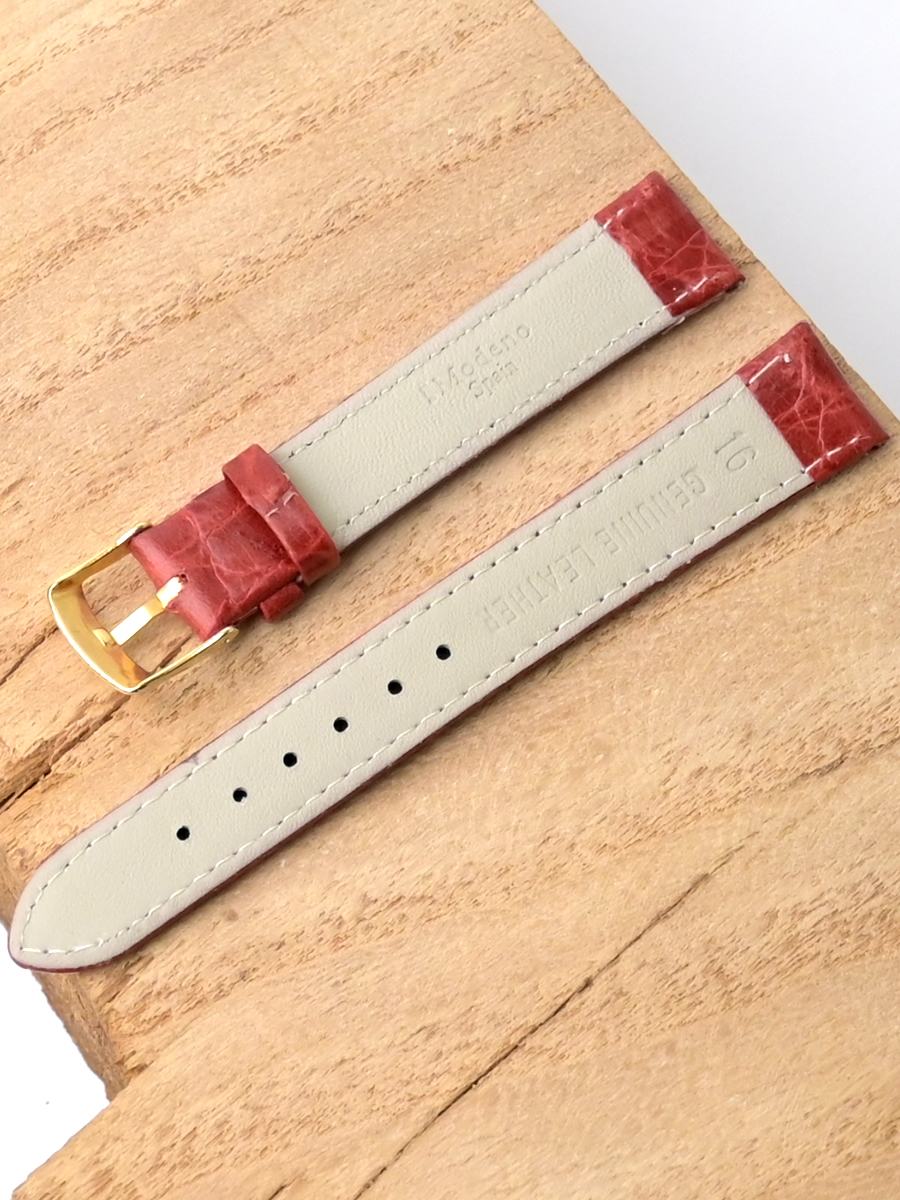 Ремешок Modeno для наручных часов, изготовленный из высококачественной натуральной кожи. Ширина крепления: 16 мм. Ширина пряжки: 14 мм. Длина большей части: 105 мм. Длина меньшей части без застежки: 75 мм. Пряжка из нержавеющей стали с покрытием цвета желтого золота.