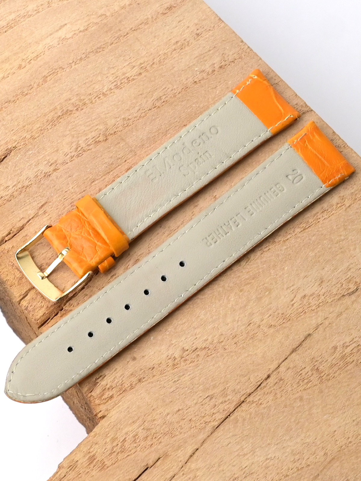 Ремешок Modeno для наручных часов, изготовленный из высококачественной натуральной кожи. Ширина крепления: 20 мм. Ширина пряжки: 18 мм. Длина большей части: 125 мм. Длина меньшей части без застежки: 85 мм. Пряжка с покрытием цвета желтого золота.