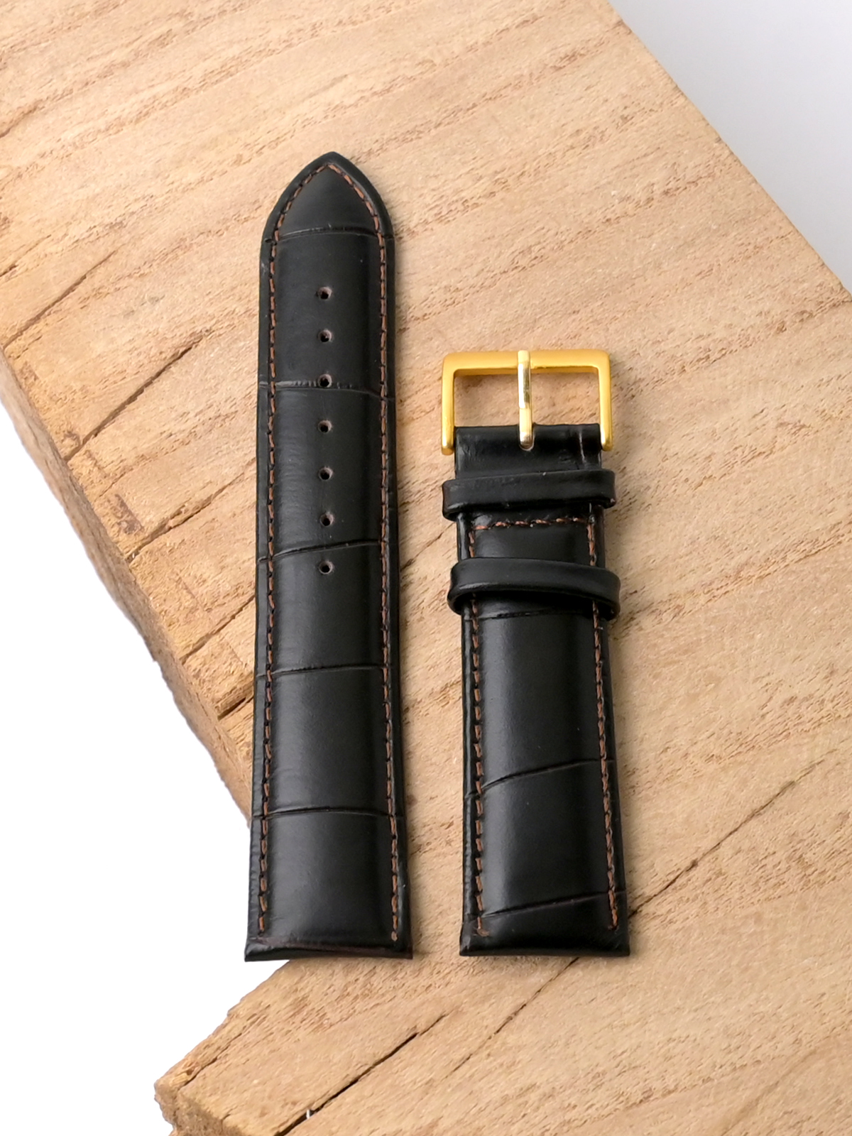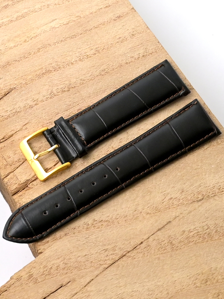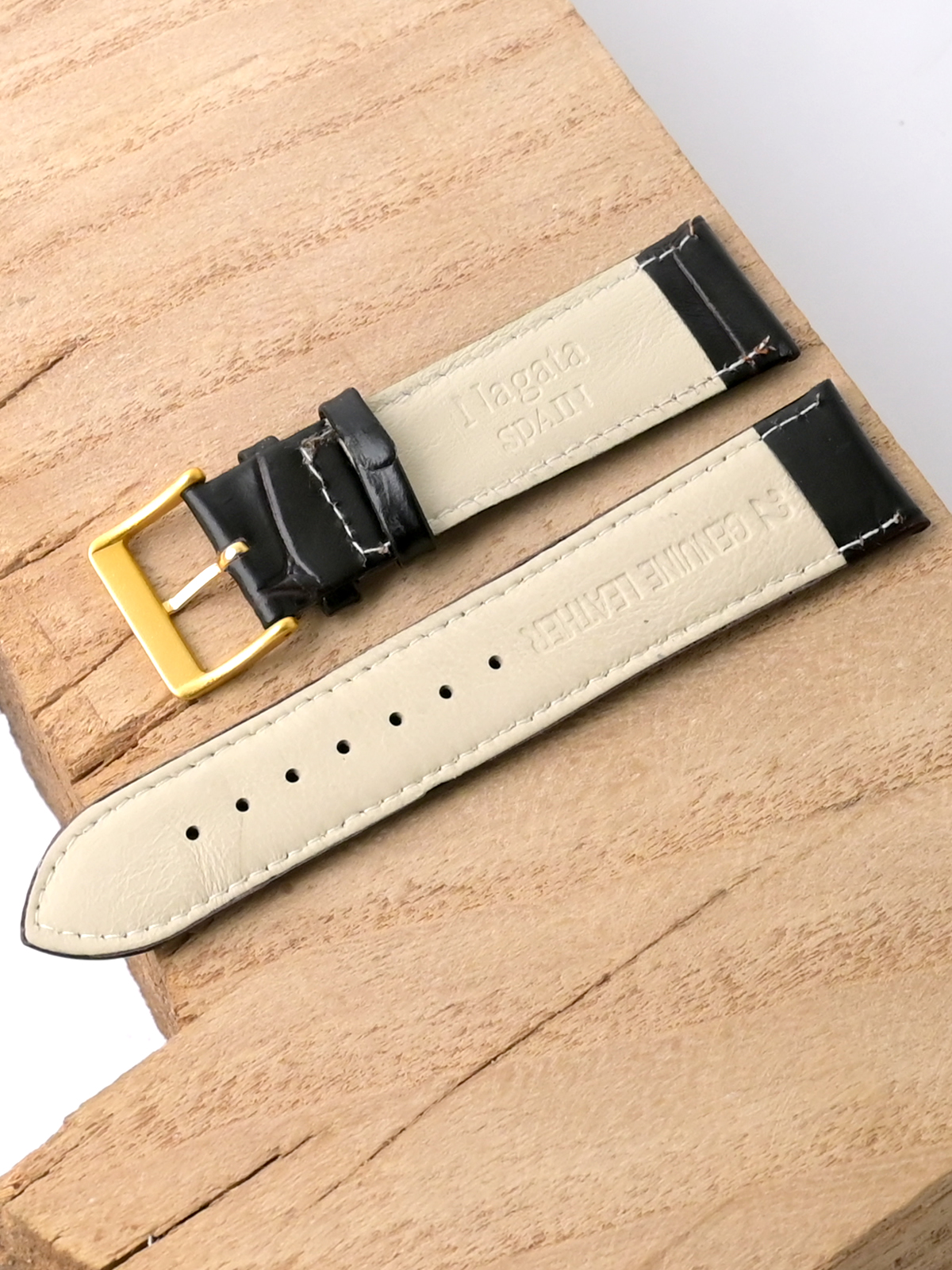 Ремешок Nagata для наручных часов, изготовленный из высококачественной натуральной кожи. Ширина крепления: 22 мм. Ширина пряжки: 20 мм. Длина большей части: 120 мм. Длина меньшей части без застежки: 75 мм. Пряжка выполнена из алюминия с покрытием цвета желтого золота.