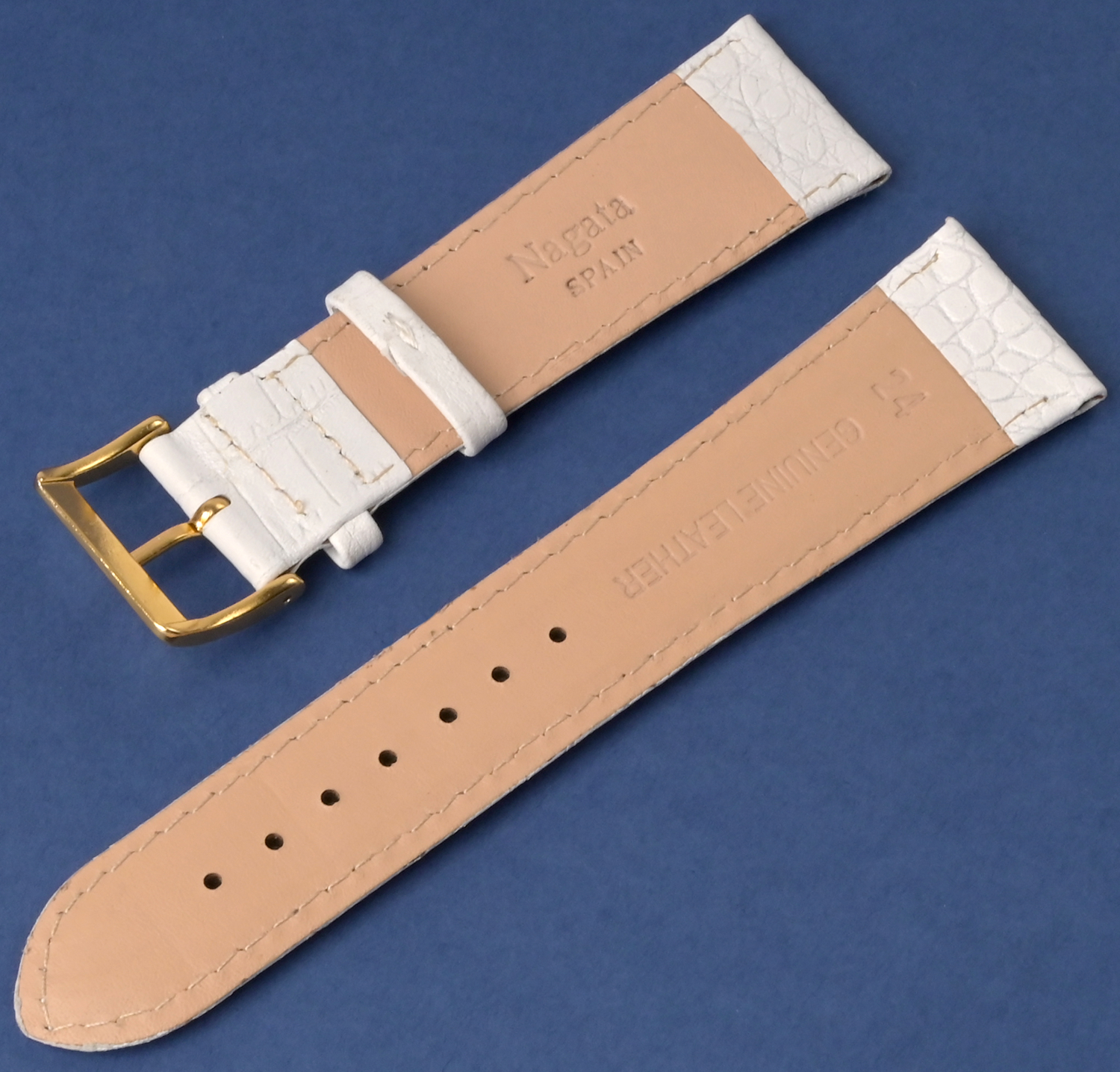 Ремешок Nagata для наручных часов, изготовленный из высококачественной натуральной кожи. Ширина крепления: 24 мм. Ширина пряжки: 20 мм. Длина большей части: 120 мм. Длина меньшей части без застежки: 75 мм. Пряжка с покрытием цвета желтого золота.