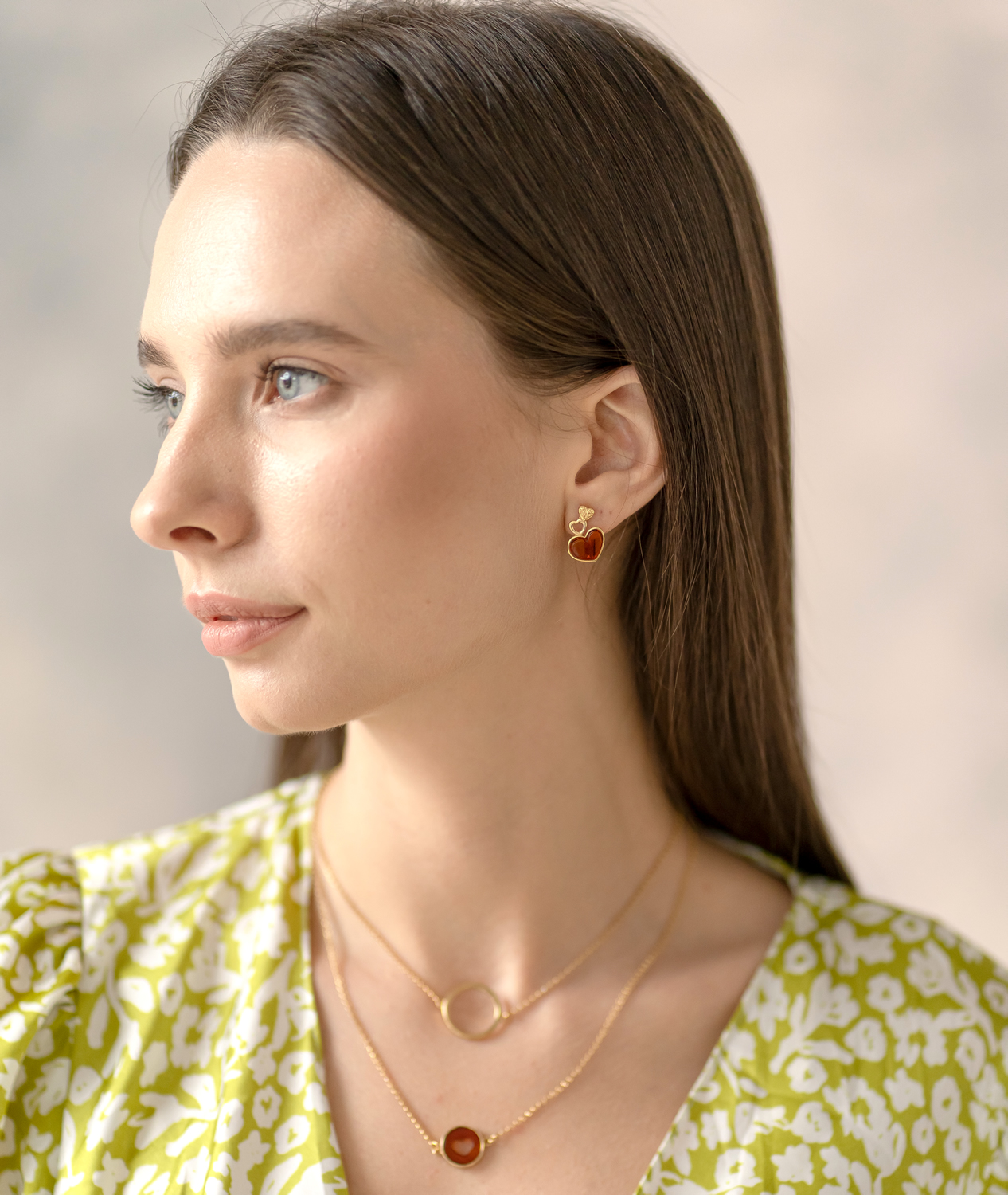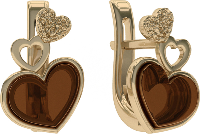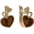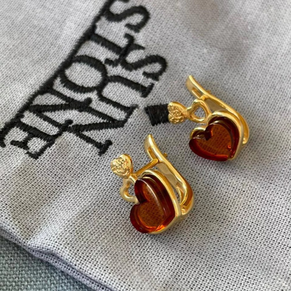 Дизайнерские серьги из золоченого серебра 925 пробы, дополненные сердечками из натурального янтаря.