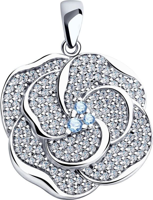 Подвеска из серебра с фианитами. Украшена 3 синими и 143 бесцветными фианитами. Ширина 20 мм. Высота 5 мм. Длина 27 мм.