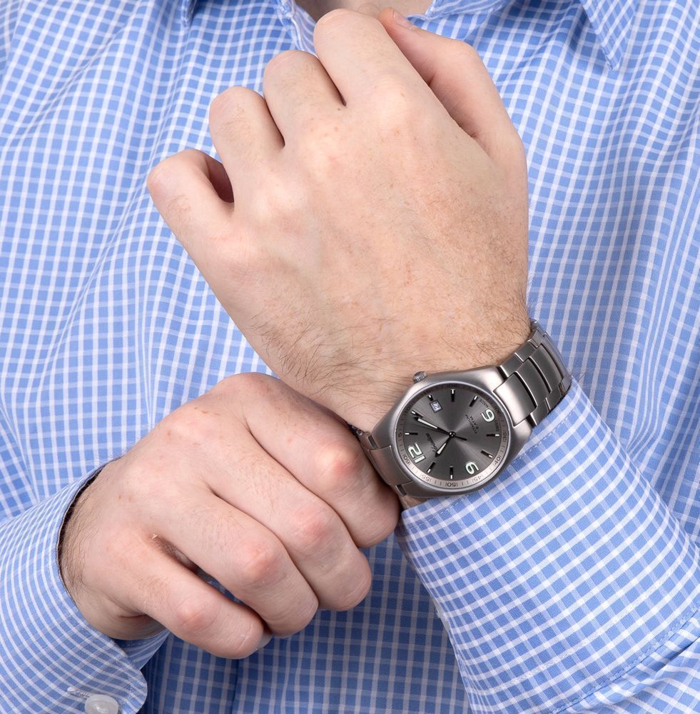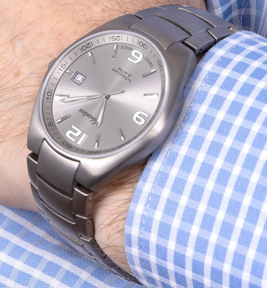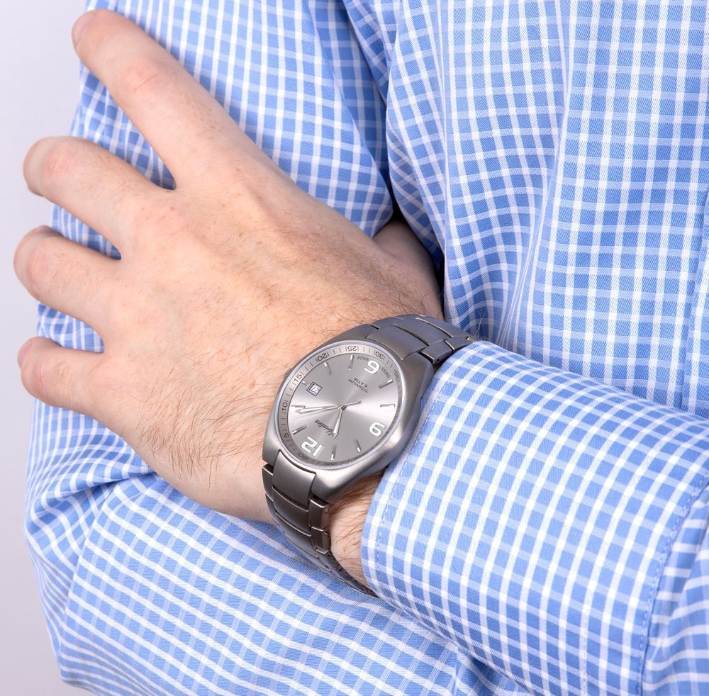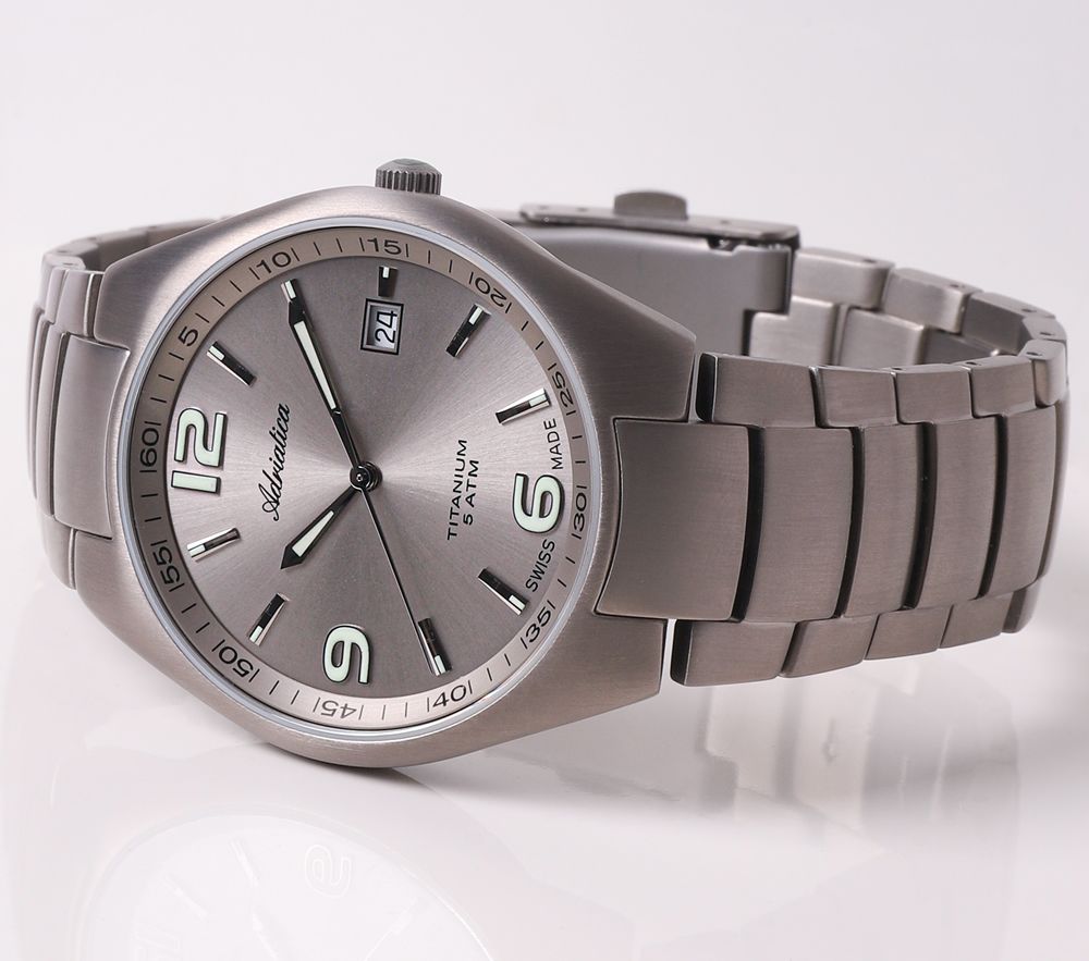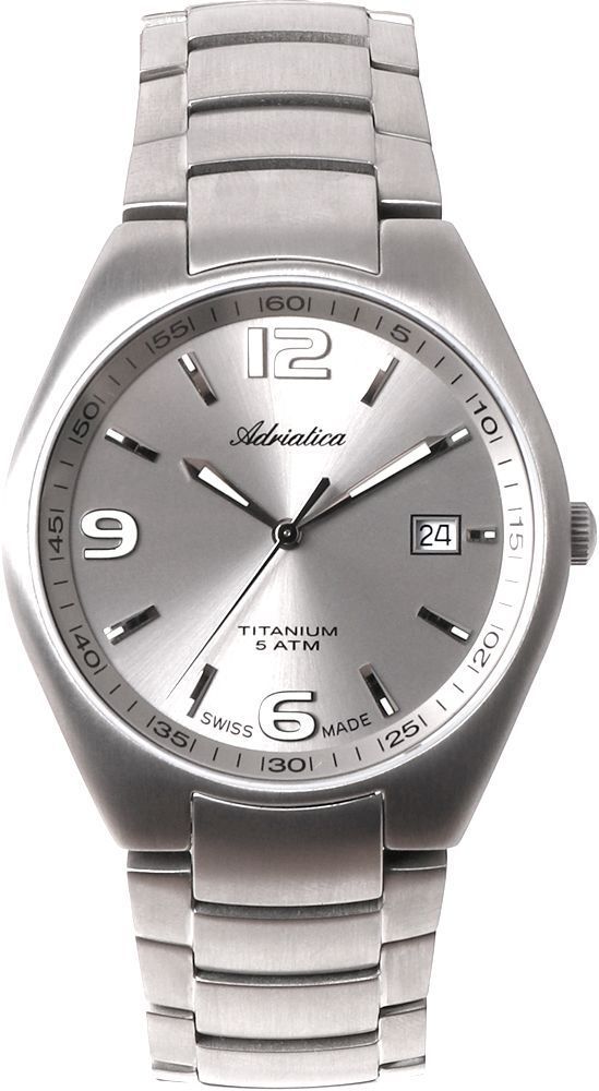 Мужские наручные часы Adriatica на титановом браслете. На циферблате присутствует апертура текущего числа. На стрелки, часовые метки и арабские цифры нанесен светонакопительный состав для возможности считывания времени в темноте. Циферблат закрывает устойчивое к потертостям и царапинам сапфировое стекло. Корпус, браслет и завинчивающаяся задняя крышка выполнены из прочного титанового сплава. Точность хода обеспечивает швейцарский кварцевый механизм Ronda 515. Вес часов 90 грамм. Гарантия 2 года.