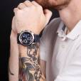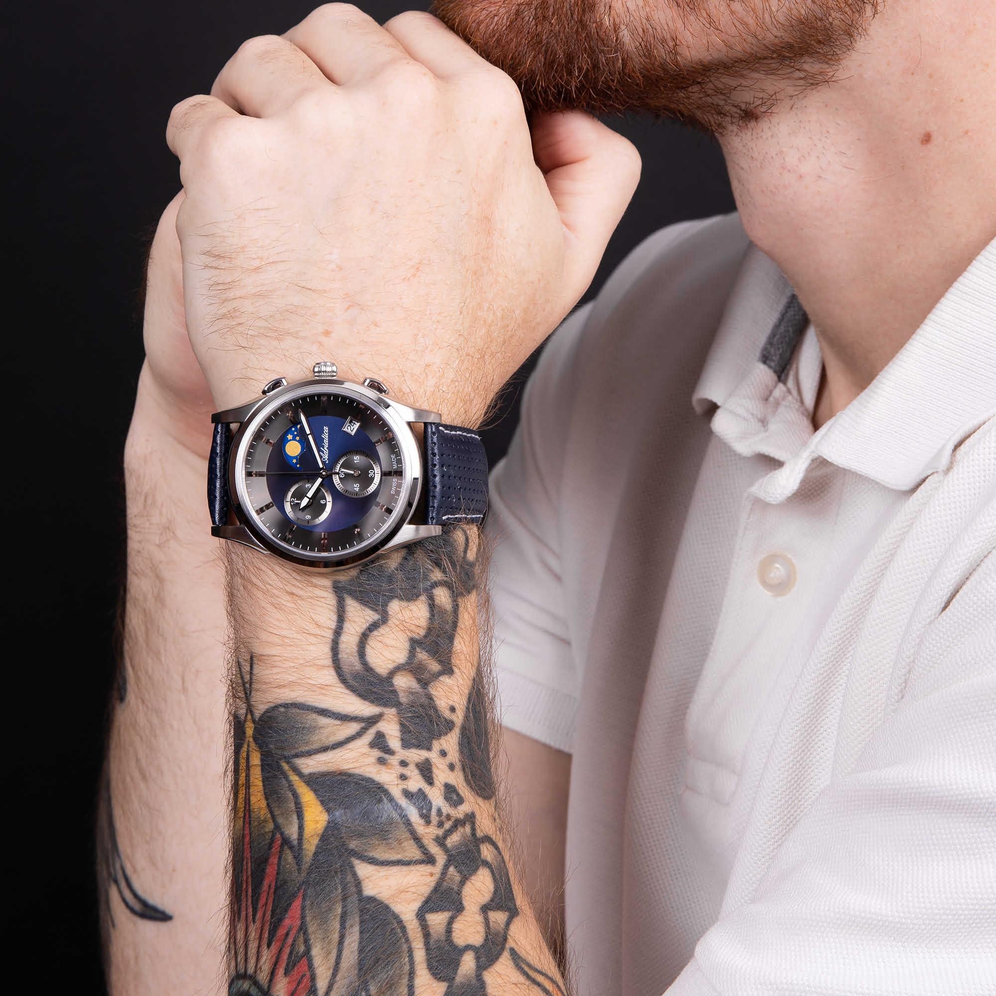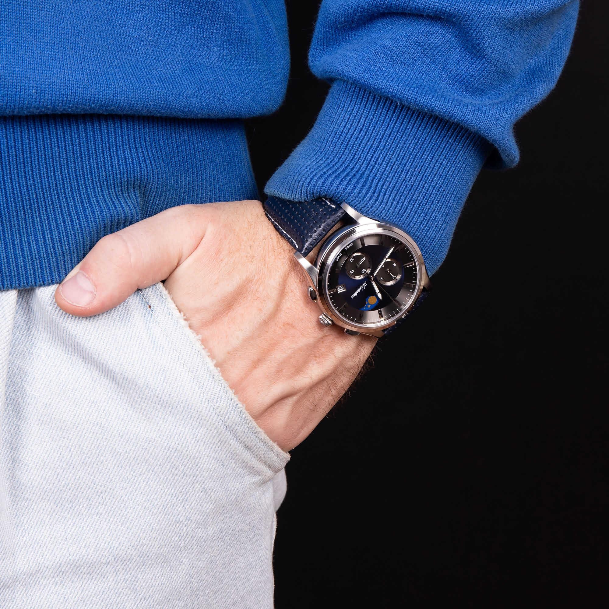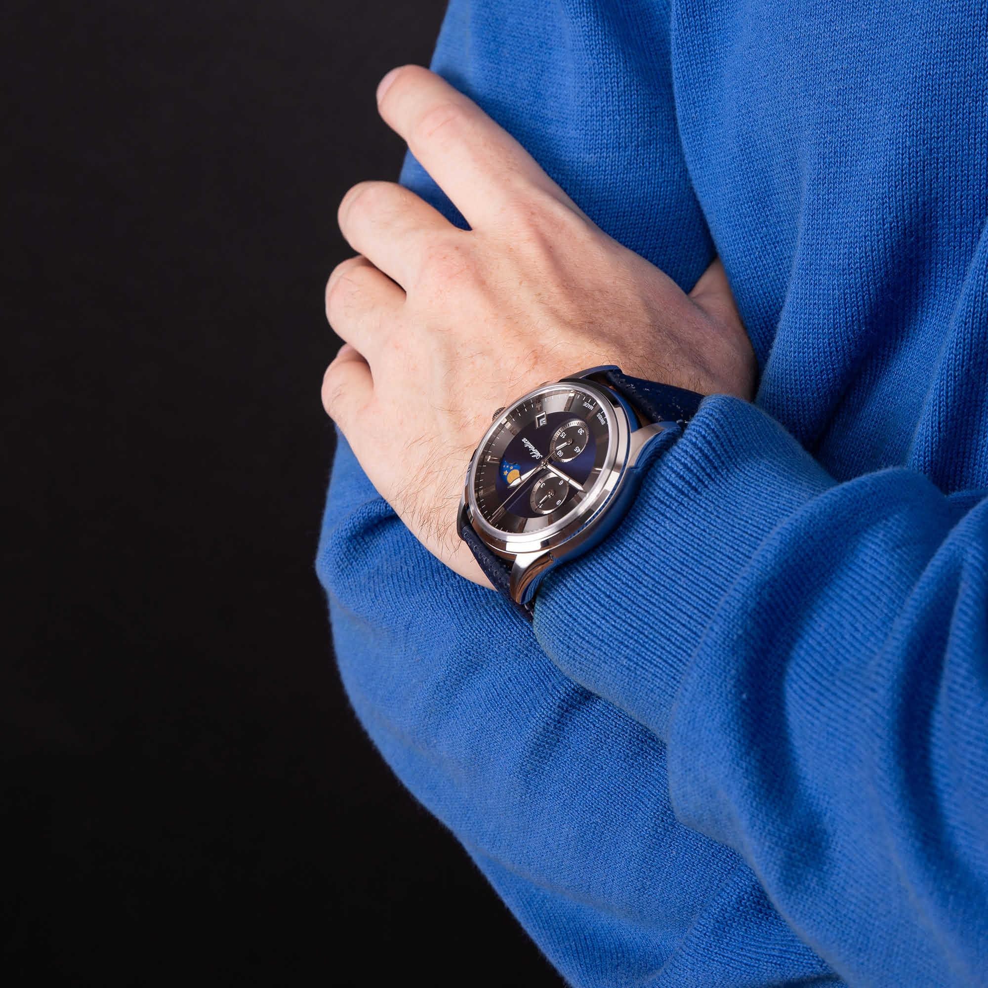 Мужские наручные часы-хронограф с секундомером. Присутствует окошко даты. Темно-синий ремешок с перфорацией и классической застежкой. Вес часов 90 грамм. Гарантия 2 года.