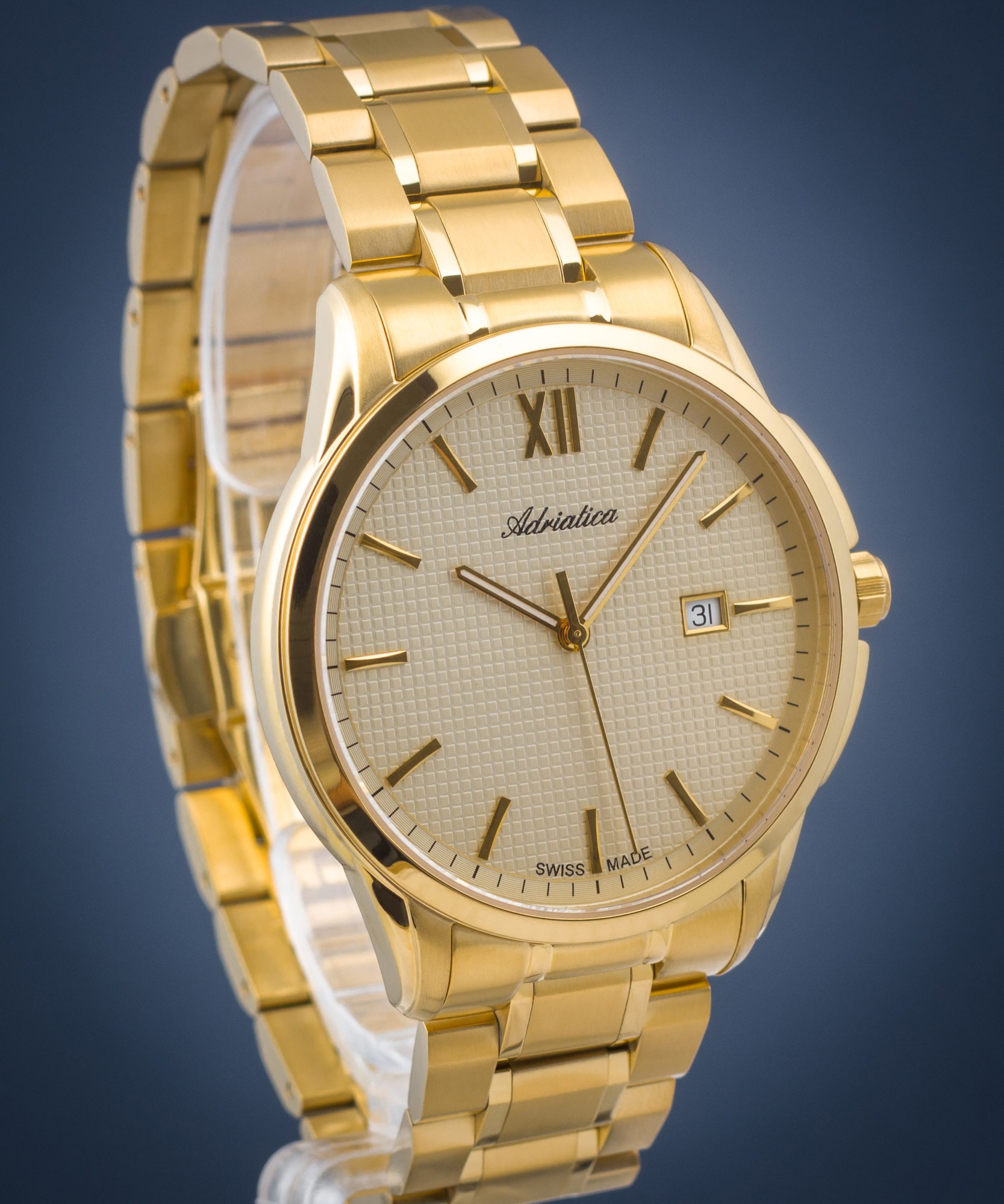 Мужские наручные часы Adriatica в классическом исполнении. Корпус и браслет выполнены из нержавеющей стали с частичным PVD покрытием. Циферблат закрывает устойчивое к царапинам и потертостям сапфировое стекло. На циферблате присутствует апертура текущего числа. Заводная головка с защитой. Браслет с раскладывающейся застежкой. Точность хода обеспечивает швейцарский кварцевый механизм ETA F06. Вес часов 145 грамм. Гарантия 2 года.