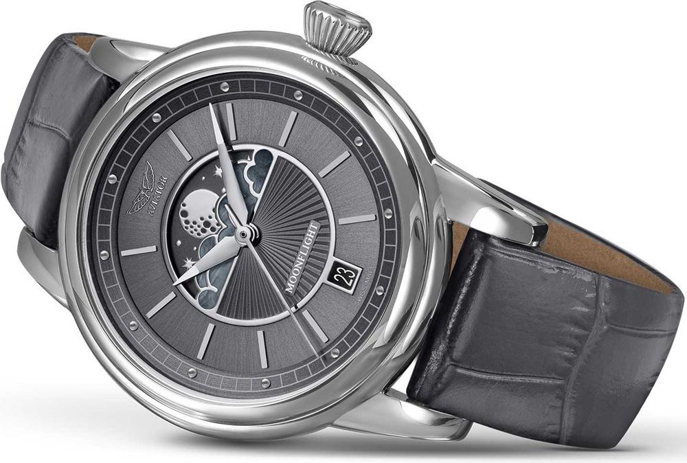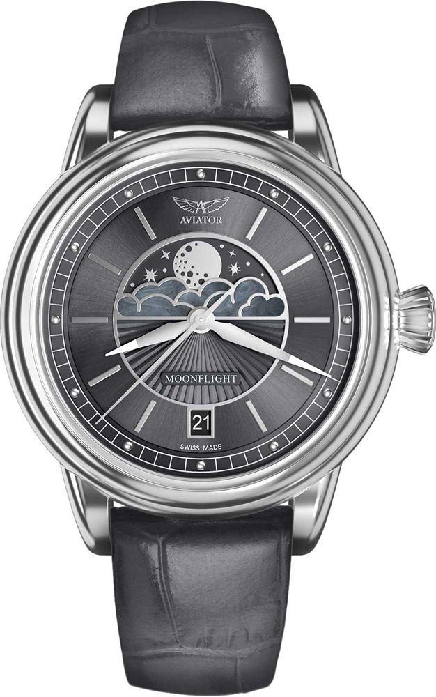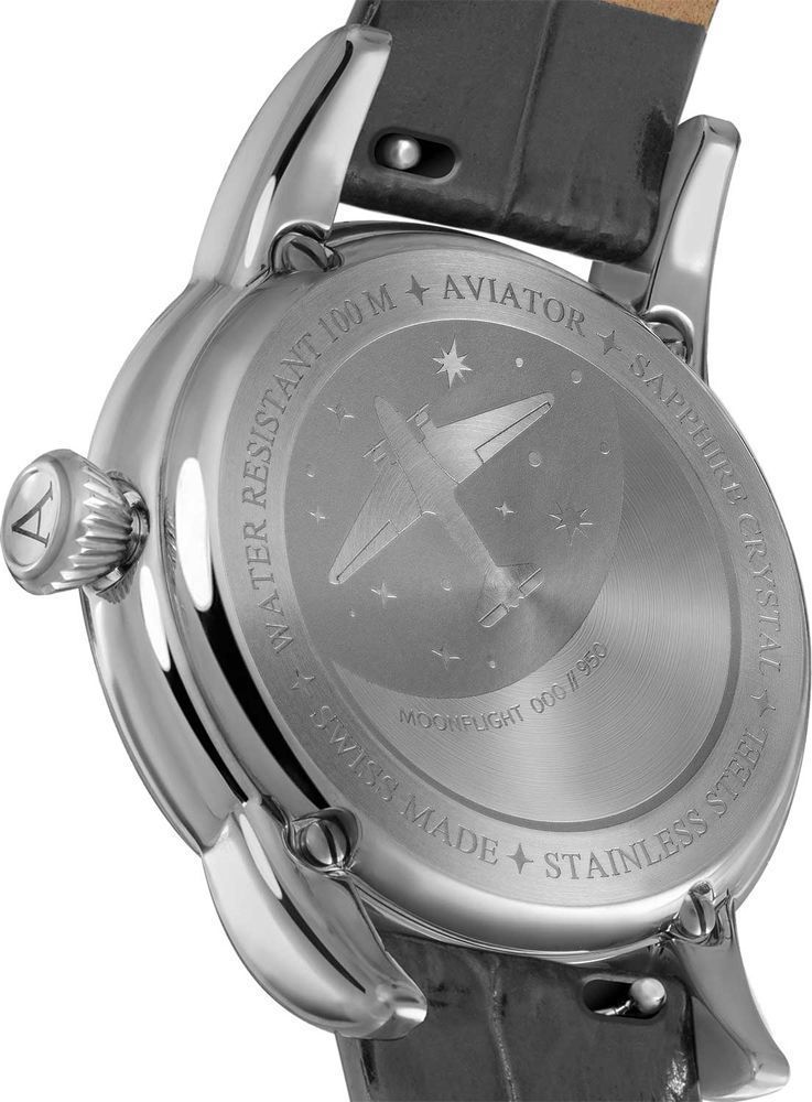 Элегантные женские наручные часы Aviator Douglas Moonflight. Лимитированная серия - 950 экземпляров. На циферблате присутствует апертура текущего числа. Облака на циферблате украшены перламутровыми вставками. Антибликовое покрытие на сапфировом стекле позволяет с легкостью узнать время даже при ярком солнце. На стрелки нанесен светонакопительный состав Superluminova для возможности считывания времени в темноте. Задняя крышка из нержавеющей стали украшена гравировкой и крепится к корпусу 4 винтами. Рифленая заводная головка. Точность хода обеспечивает швейцарский кварцевый механизм Ronda 708. Кожаный текстурированный ремешок с возможностью быстрой замены. Гарантия 2 года.