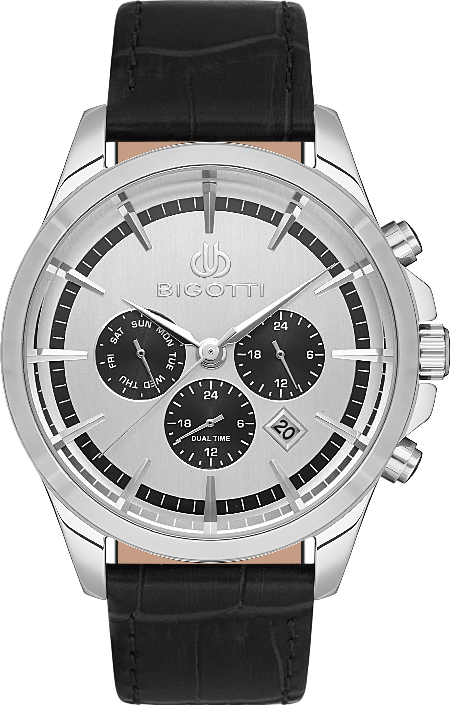 Стильные и функциональные мужские часы Bigotti. На малых циферблатах отображаются второй часовой пояс, день недели и текущее время в 24-х часовом формате. Присутствует окошко даты. Заводная головка с защитой. Ремешок с классической застежкой. Гарантия 1 год.