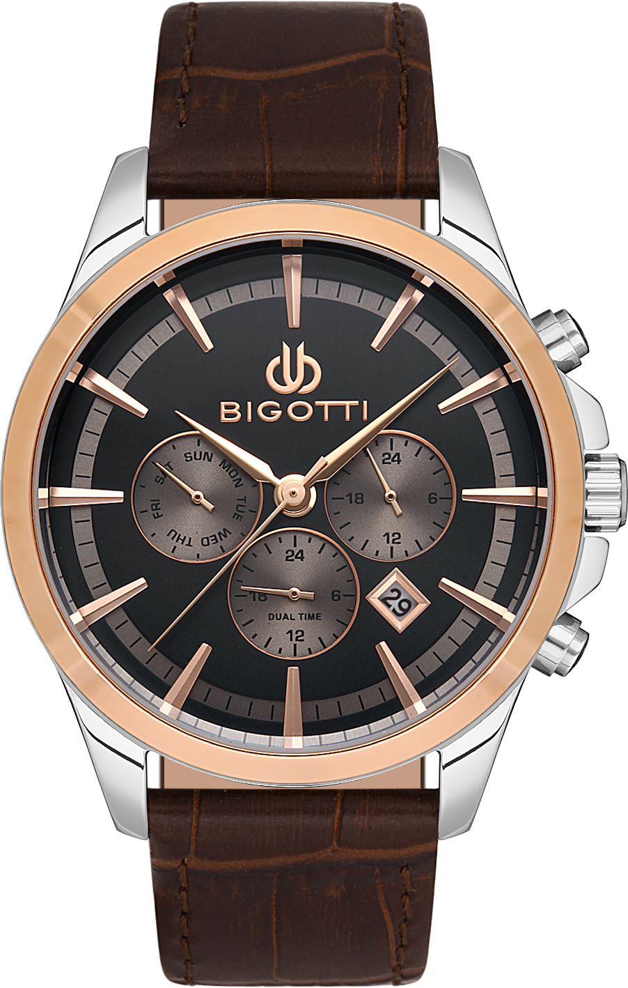 Стильные и функциональные мужские часы Bigotti. На малых циферблатах отображаются второй часовой пояс, день недели и текущее время в 24-х часовом формате. Присутствует окошко даты. Заводная головка с защитой. Ремешок с классической застежкой. Гарантия 1 год.