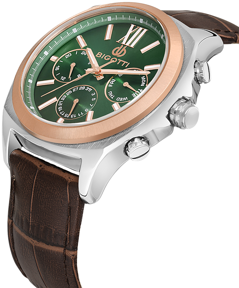 Мужские классические часы Bigotti с дополнительным отображением на малых циферблатах даты, дня недели и текущего времени в 24-х часовом формате. Заводная головка с защитой. Завинчивающаяся задняя крышка. Ремешок с классической застежкой. Гарантия 1 год.