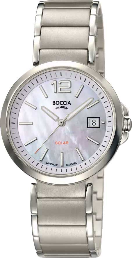 Титановые наручные часы Boccia Titanium с питанием от солнечной энергии, не требующее замены батарейки. Присутствует окошко даты. Заводная головка с защитой. Браслет с раскладывающейся застежкой. Гарантия 2 года.