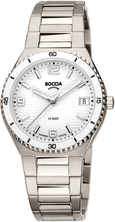 Женские наручные часы Boccia с титановым круглым корпусом и титановым браслетом. Присутствует окошко даты. Керамическая вставка на безеле. Браслет с раскладывающейся застежкой. Гарантия 2 года.