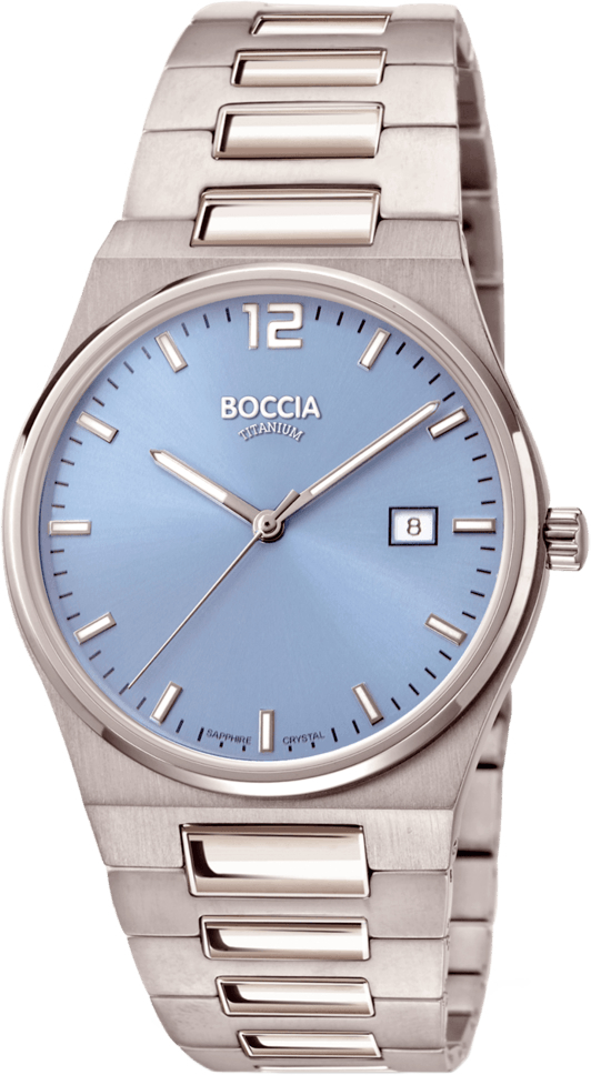 Мужские наручные часы Boccia с круглым титановым корпусом. Присутствует окошко даты. Браслет с раскладывающейся застежкой. Гарантия 2 года.