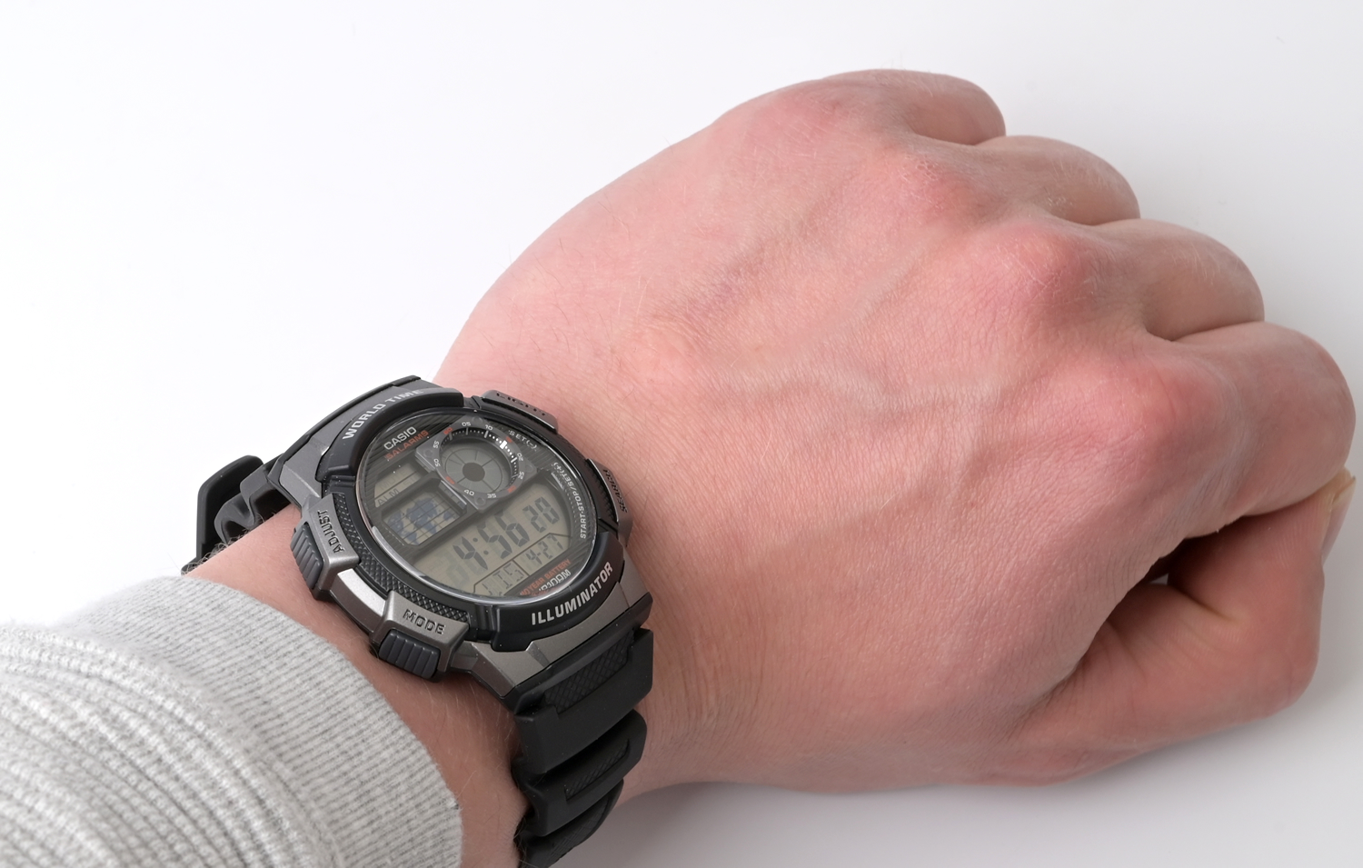 Мужские функциональные часы Casio с цифровым дисплеем. Циферблат подсвечивается светодиодом. Мировое время – 48 городов (31 часовой пояс), всемирное координированное время (UTC). Функция включения/отключения летнего времени. 12-ти и 24-х часовой формат времени. Секундомер с точностью показаний 1/100 сек. и временем измерения 24 часа. Сплит-хронограф. Таймер обратного отсчета от 1 мин. до 24 ч. Функция включения/отключения звука. Батарея рассчитана на 10 лет. 5 будильников, ежечасный сигнал. Задняя крышка из нержавеющей стали с креплением к корпусу на винтах. Ремешок с классической застежкой. Вес часов всего 40 грамм. Гарантия 1 год.