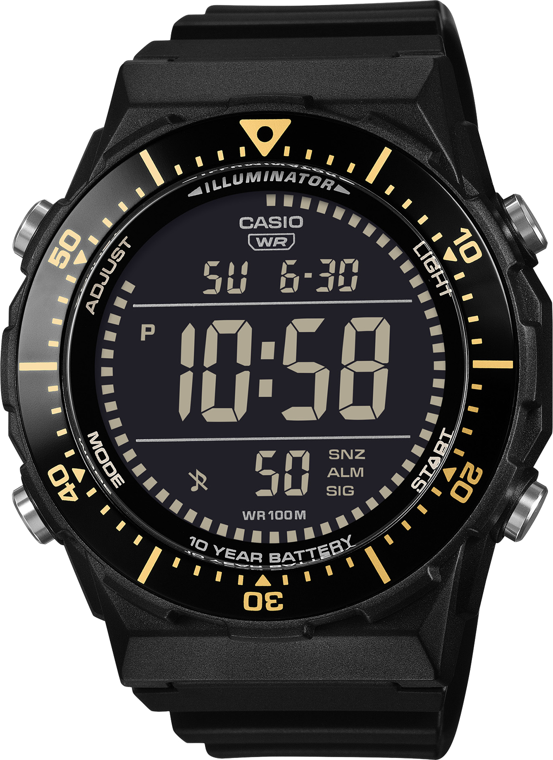 Многофункциональные цифровые часы с широким, легко читаемым дисплеем и вращающимся безелем - идеально подходят для занятий спортом. 12-ти и 24-х часовой формат отображения времени. Секундомер с точностью до 1/100 секунды, диапазон измерения 24 часа. Таймер обратного отсчета от 1 минуты до 24 часов. 3 независимых многофункциональных будильника (2 одноразовых и 1 с функцией повтора/одноразового срабатывания). Типы будильников: ежедневный будильник, будильник по дате, будильник на месяц, ежемесячный будильник.