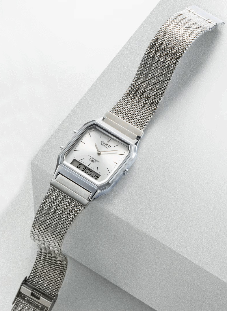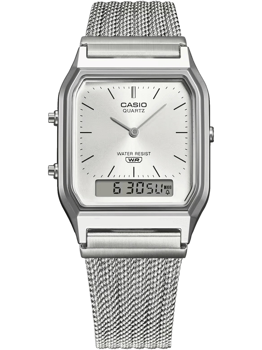 Наручные часы Casio в ретро-стиле. Второй часовой пояс. 12-ти и 24-х часовой формат времени. Секундомер с точностью показаний 1/100 сек. и временем измерения 1 час, сплит-хронограф. Циферблат с метками в виде штрихов выполнен по технологии Sunray (солнечные лучи). Батарея рассчитана на 3 года. Браслет миланского плетения с регулируемой застежкой. Вес часов 52 грамма. Гарантия 1 год.