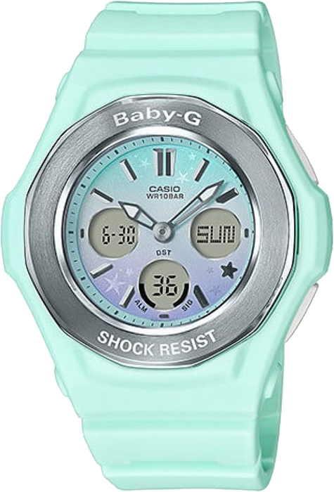Яркие спортивные женские часы Casio Baby-G. Минималистичность дизайна и приятные цветовые оттенки создали уникальный внешний вид, благодаря которому, модель будет привлекать взгляды окружающих и дополнять собой любые ваши образы. 12-ти и 24-х часовой формат отображения времени.  Секундомер с точностью в 1/100 секунды, время измерения - 1 час. Таймер обратного отсчета от 1 минуты до 24 часов, автоповтор. Автоматический календарь до 2099 года. 5 ежедневных будильников, ежечасный сигнал. Мировое время 29 часовых поясов (48 городов), переход на летнее время (вкл./выкл). Ремешок с классической застежкой. Вес часов 42 грамма. Гарантия 1 год.