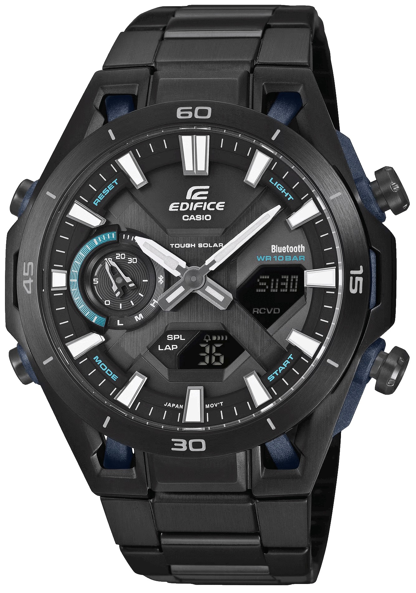 Стильные и функциональные мужские часы Casio Edifie в усиленном карбоном корпусе. Питание от солнечной энергии Tough Solar - солнечные батарейки большой мощности, индикатор заряда батареи. Функция автоматического сохранения энергии. Время работы аккумулятора без подзарядки приблизительно 7 месяцев, при включенной функции сохранения энергии приблизительно 18 месяцев. Двойная светодиодная подсветка Super Illuminator с функцией Afterglow (для подсветки не нужно удерживать кнопку, время послесвечения настраивается 1,5 или 3 сек): одновременно подсвечивается аналоговый циферблат и цифровой дисплей. При наклоне часов в сторону лица для считывания, функция автоподсветки обеспечивает автоматическое включение светодиодной подсветки. Цвет подсветки: белый. Необритовое светонакопительное покрытие обеспечивает длительное послесвечение в темноте даже после кратковременного нахождения на свету. 12-ти и 24-х часовой формат времени. Секундомер с двумя точностями показаний: 1/100с (до 1ч) и 1с (после 1ч) и временем измерения 24ч. SPLIT-хронограф. Таймер обратного отсчета от 1с до 24ч. Мировое время – 38 городов (38 часовых поясов), всемирное координированное время (UTC). Автоматический переход на зимнее и летнее время, возможность включения/отключения данной функции. Переключение между домашним и мировым временем. Беспроводная технология Bluetooth® со сверхнизким потреблением энергии для синхронизации со смартфоном. При подключении к смартфону часы корректируют текущее время, настраивают будильник, а также копируют настройки мирового времени (до 300 городов). Приложение EDIFICE Connected позволяет вести журнал показаний секундомера и прохождения этапов, вычислять разность между заданным временем и временем этапа. Отображение дней недели на шести языках. Функции перемещения стрелок, поиска телефона и включения/отключения звука. Карбоновый безель. Стальная задняя крышка крепится на 4-х винтах. Водонепроницаемость 10 Бар в соответствии с ISO 2281. Браслет с раскладывающейся тройной застежкой, расстегиваемой одним касанием. Вес часов 122 грамма. Гарантия 1 год.