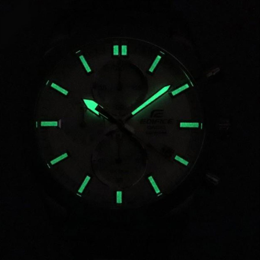 Мужские наручные часы-хронограф Casio Edifice с секундомером. Присутствует окошко даты. Секундомер с точностью 1/10 и временем измерения 1 час. Циферблат закрывает устойчивое к потертостям и царапинам сапфировое стекло. Питание от батарейки SR920SW, рассчитанной на 3 года работы без замены. Завинчивающаяся задняя крышка. Браслет с раскладывающейся застежкой, обхват запястья от 150 до 205 мм. Вес часов 135 грамм. Гарантия 1 год.
