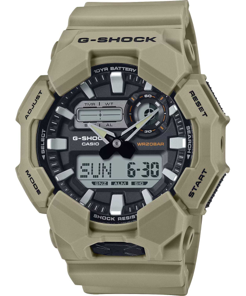 Новинка в линейке G-Shock. Корпус и ремешок выполнены из биопластика, который изготавливается из возобновляемых органических ресурсов. Структура Carbon Core Guard. Противоударный корпус с карбоновыми волокнами более прочный и, в то же время, более легкий. Этот же материал защищает внутренний модуль от повреждений и деформаций при ударах. Циферблат подсвечивается ярким светодиодом. Настраиваемое послесвечение 1,5 или 3сек. Цвет подсветки: белый. Необритовое светонакопительное покрытие обеспечивает длительное послесвечение в темноте даже после кратковременного нахождения на свету. 12-ти и 24-х часовой формат времени. Секундомер с точностью показаний 1/100 сек. и временем измерения 24 часа, сплит-хронограф. Таймер обратного отсчета от 1 мин до 1 часа. Мировое время – 48 городов (31 часовой пояс), всемирное координированное время (UTC). Функция включения/отключения летнего времени. Переключение между домашним и мировым временем. Функции отключения/включения звука и перемещения стрелок для беспрепятственного просмотра информации на цифровых дисплеях. Батарея рассчитана на 10 лет. Стальная задняя крышка крепится на 4-х винтах. Ремешок с классической застежкой. Вес часов 67 грамм. Гарантия 1 год.