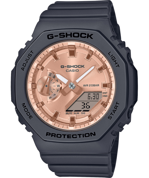 Женские спортивные часы G-Shock. Часы со структурой Carbon Core Guard. Противоударный пластиковый корпус с карбоновыми волокнами более прочный и, в то же время, более легкий. Этот же материал защищает внутренний модуль от повреждений и деформаций при ударах. Электролюминесцентная подсветка освещает весь циферблат. Функция парный иллюминатор обеспечивает подсветку не только аналогового циферблата, но и цифрового дисплея. Послесвечение. Цвет подсветки: белый. Необритовое светонакопительное покрытие обеспечивает длительное послесвечение в темноте даже после кратковременного нахождения на свету. 12-ти и 24-х часовой формат времени. Секундомер с двумя точностями показаний: 1/100с (до 1ч) и 1с (после 1ч) и временем измерения 24ч. SPLIT-хронограф. Таймер обратного отсчета от 1сек до 24ч с автоповтором. Мировое время – 48 городов (31 часовой пояс), всемирное координированное время (UTC). Функция включения/отключения летнего времени. Ретроградный указатель для недели. Функции отключения/включения звука и перемещения стрелок для беспрепятственного просмотра информации на цифровых дисплеях. Батарейка рассчитана на 3 года. Водонепроницаемость в соответствии с ISO 2281. Ремешок из полимерного материала с классической застежкой и системой быстрой замены. Вес 41 грамм. Гарантия 1 год.