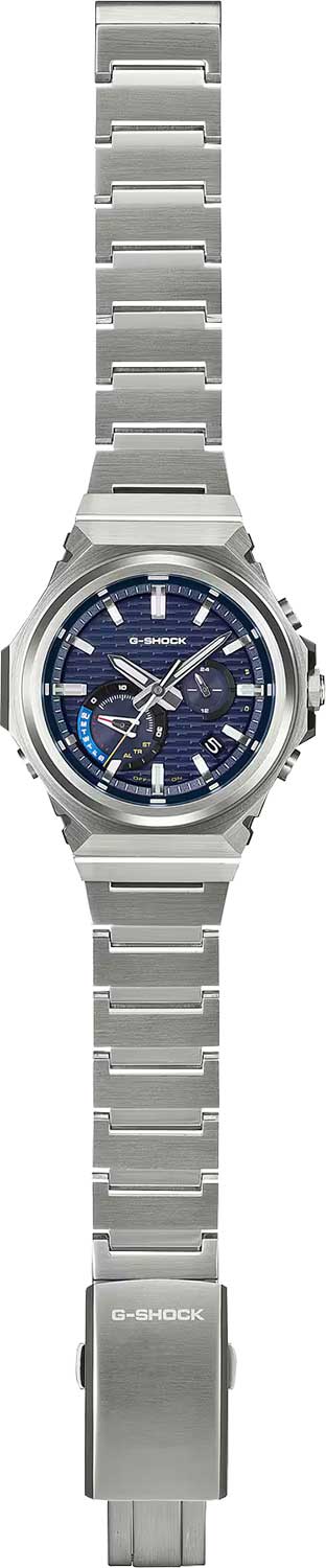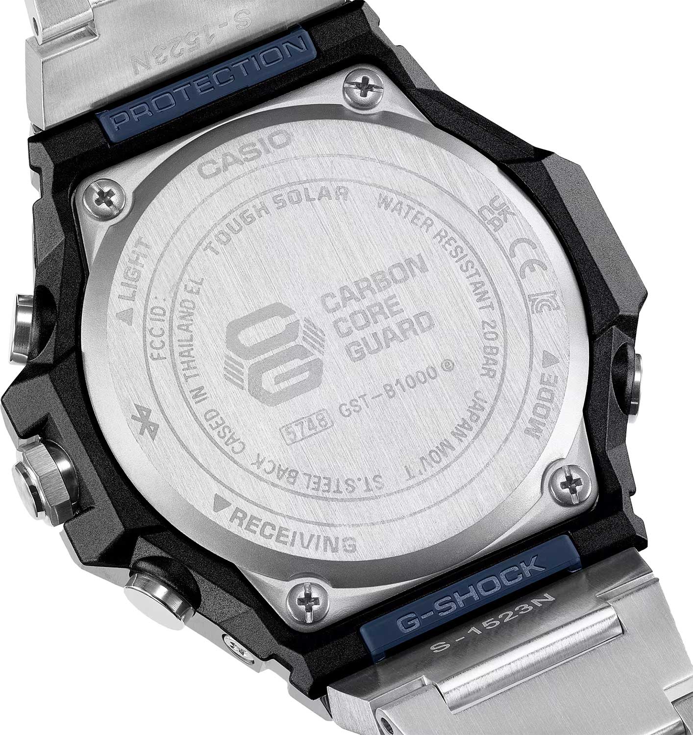 Мужские наручные часы G-Shock из серии G-STEEL в стальном корпусе с текстурным циферблатом под закаленным минеральным стеклом. Новый корпус GST-B1000 из стали и карбона отличается лаконичностью ввиду отсутствия фирменных надписей, которые вы найдете на других моделях G-STEEL и имеет толщину всего 11.6 мм и 44 мм в диаметре. Питание от солнечной энергии Tough Solar - солнечные батарейки большой мощности, индикатор низкого заряда батареи. Функция автоматического сохранения энергии. Время работы аккумулятора без подзарядки приблизительно 5 месяцев, при включенной функции сохранения энергии приблизительно 18 месяцев. Структура Carbon Core Guard. Противоударный корпус с карбоновыми волокнами более прочный и в то же время более легкий. Этот же материал защищает внутренний модуль от вибрации, повреждений и деформаций при ударах. Циферблат подсвечивается светодиодом, послесвечение. Необритовое светонакопительное покрытие обеспечивает длительное послесвечение в темноте даже после кратковременного нахождения на свету. 12-ти и 24-х часовой формат времени. Секундомер с точностью показаний 1 секунда и временем измерения 30 минут. Таймер обратного отсчета от 1 минуты до 30 минут. Беспроводная технология Bluetooth® со сверхнизким потреблением энергии для синхронизации со смартфоном. При подключении к смартфону часы корректируют текущее время. Функции отключения/включения звука, поиска телефона. Ретроградный указатель дня недели. Присутствует окошко даты. Завинчивающаяся заводная головка с защитой. Стальная задняя крышка крепится на 4-х винтах. Литой браслет с тройной раскладывающейся застежкой, расстегиваемой одним касанием. Вес часов 118 грамм. Гарантия 1 год.