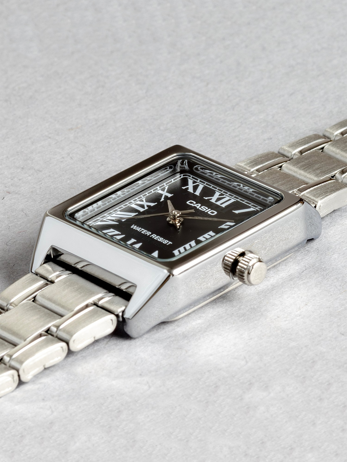 Классические женские часы Casio с прямоугольным корпусом. Точность хода обеспечивает японский кварцевый механизм. Батарейка SR626SW рассчитана на 3 года. Браслет с раскладывающейся застежкой, обхват запястья от 125 до 185 мм. Вес часов 51 грамм. Гарантия 1 год.
