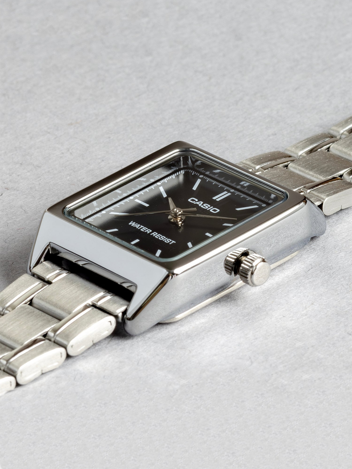 Классические женские часы Casio с прямоугольным корпусом. Точность хода обеспечивает японский кварцевый механизм. Батарейка SR626SW рассчитана на 3 года. Браслет с раскладывающейся застежкой, обхват запястья от 125 до 185 мм. Вес часов 51 грамм. Гарантия 1 год.