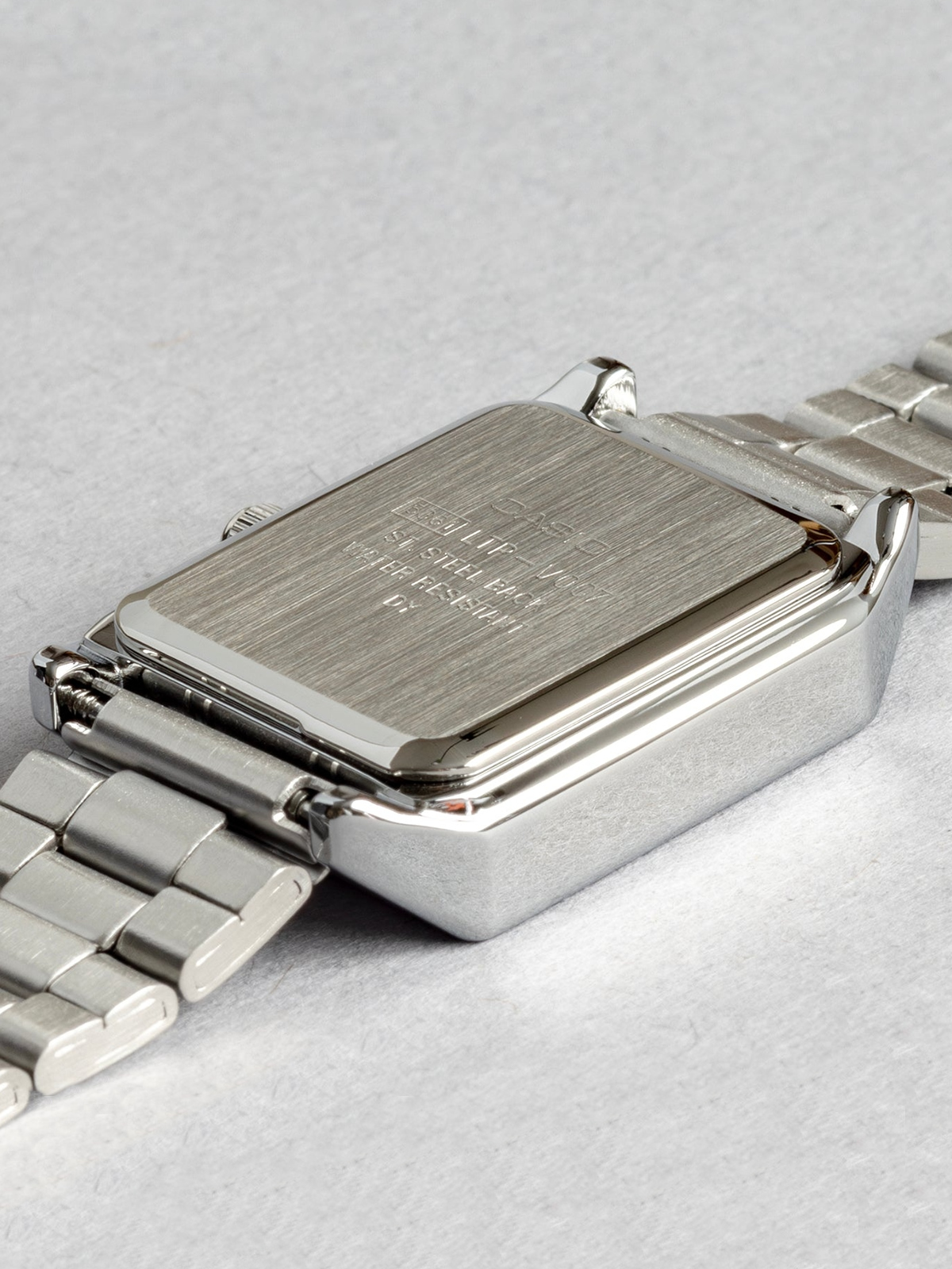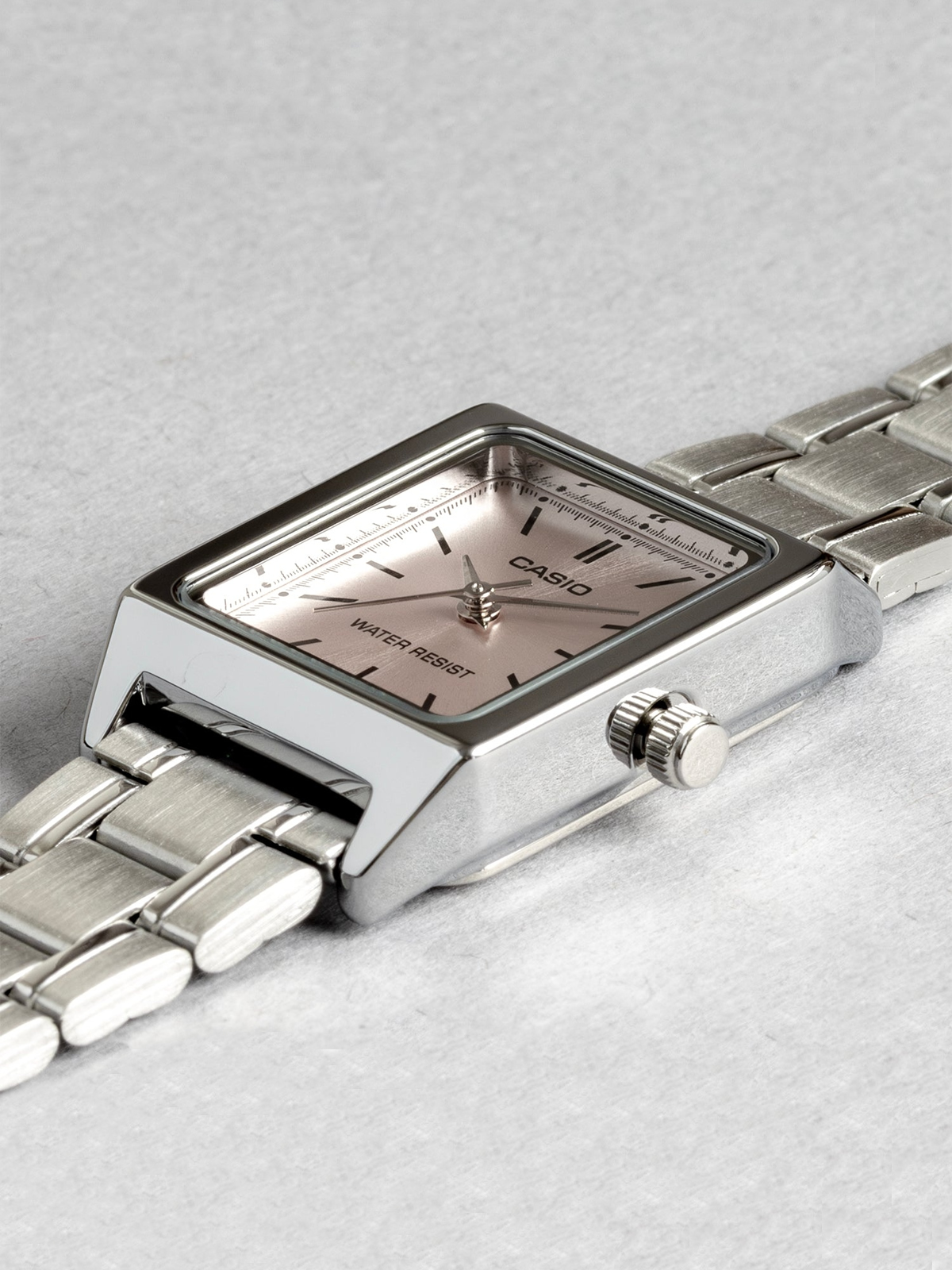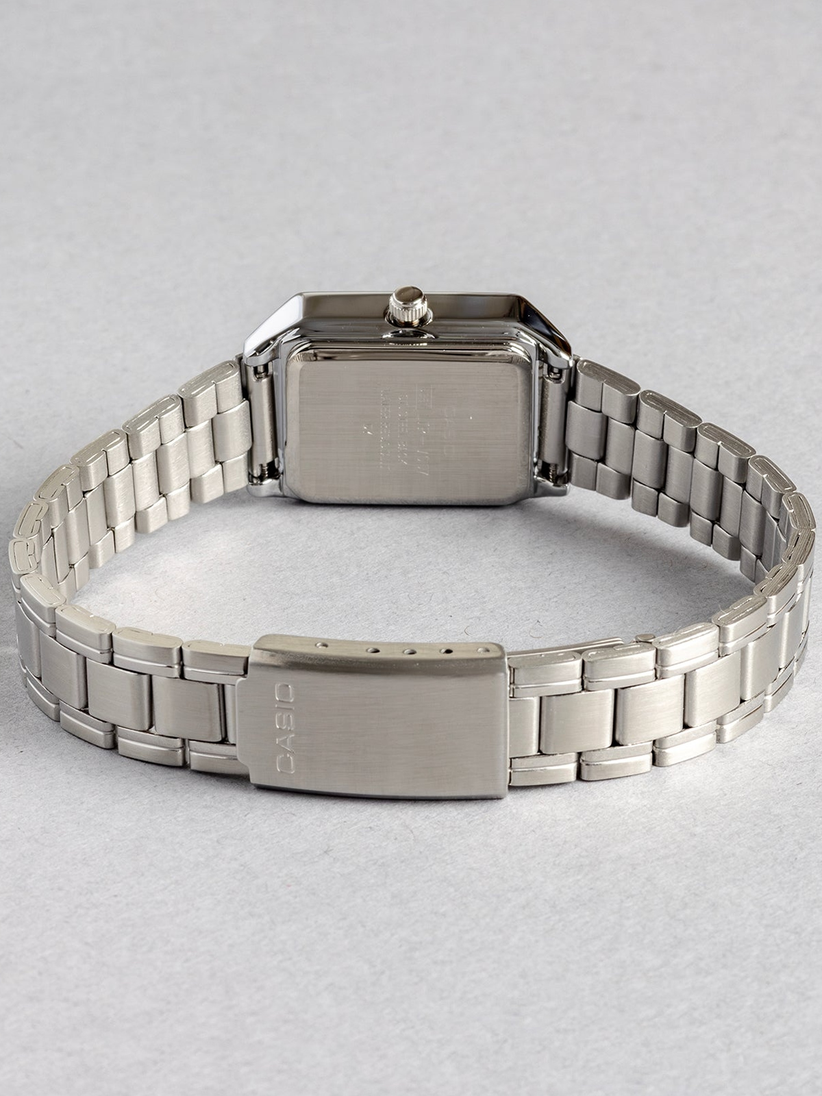 Классические женские часы Casio с прямоугольным корпусом. Точность хода обеспечивает японский кварцевый механизм. Батарейка SR626SW рассчитана на 3 года. Браслет с раскладывающейся застежкой, обхват запястья от 125 до 185 мм. Вес часов 51 грамм. Гарантия 1 год.