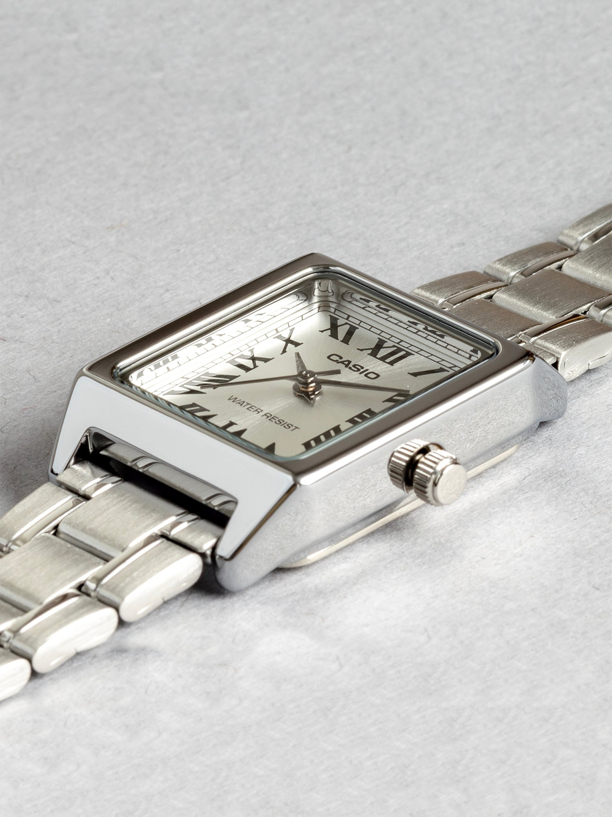 Классические женские часы Casio с прямоугольным корпусом. Точность хода обеспечивает японский кварцевый механизм. Батарейка SR626SW рассчитана на 3 года. Браслет с раскладывающейся застежкой, обхват запястья от 125 до 185 мм. Вес часов 51 грамм. Гарантия 1 год.