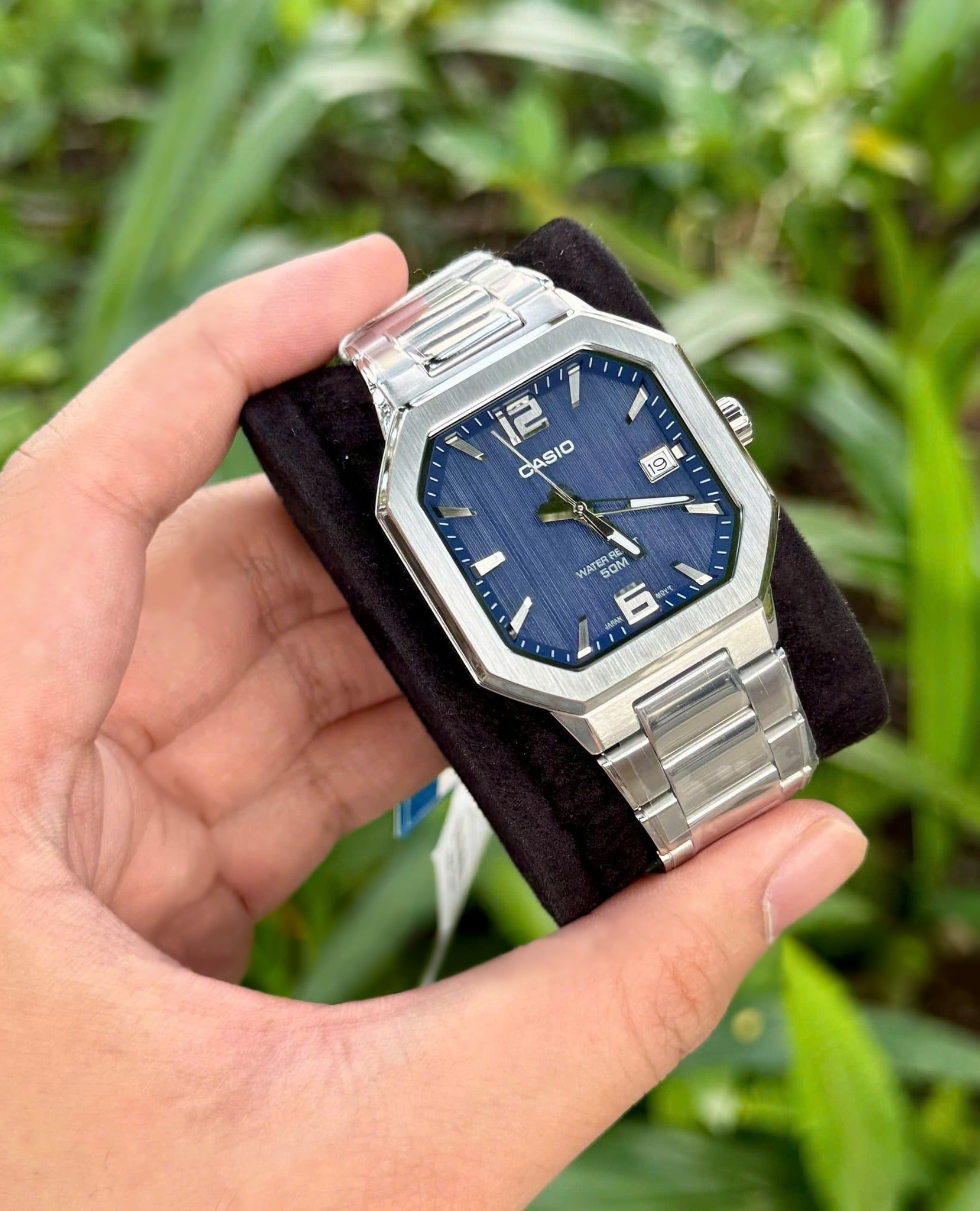 Мужские наручные часы Casio с прямоугольным корпусом. Присутствует окошко даты. Батарейка рассчитана на 3 года работы без замены. Браслет с тройной раскладывающейся застежкой, расстегиваемой одним касанием. Вес часов 114 грамм. Гарантия 1 год.