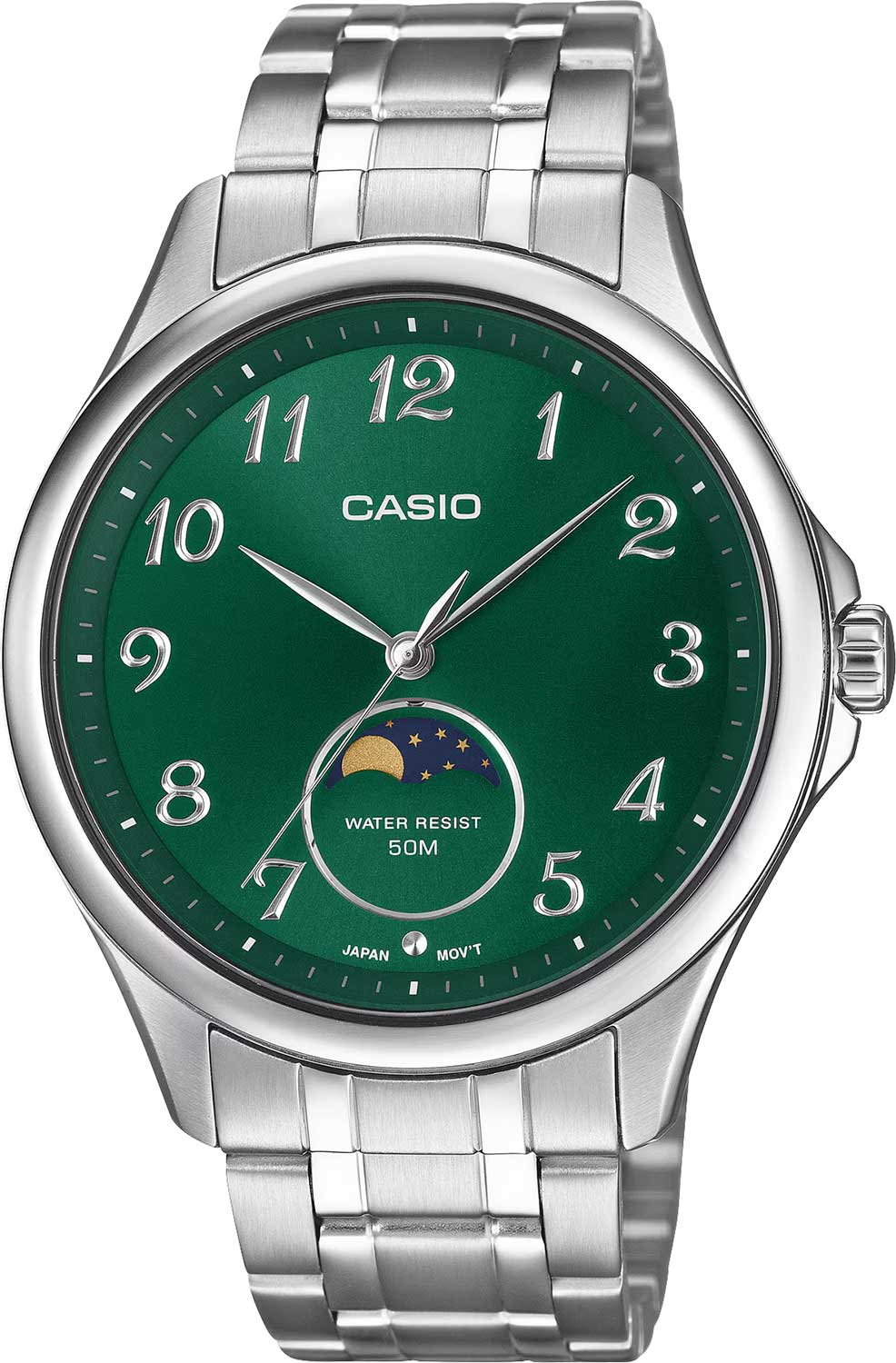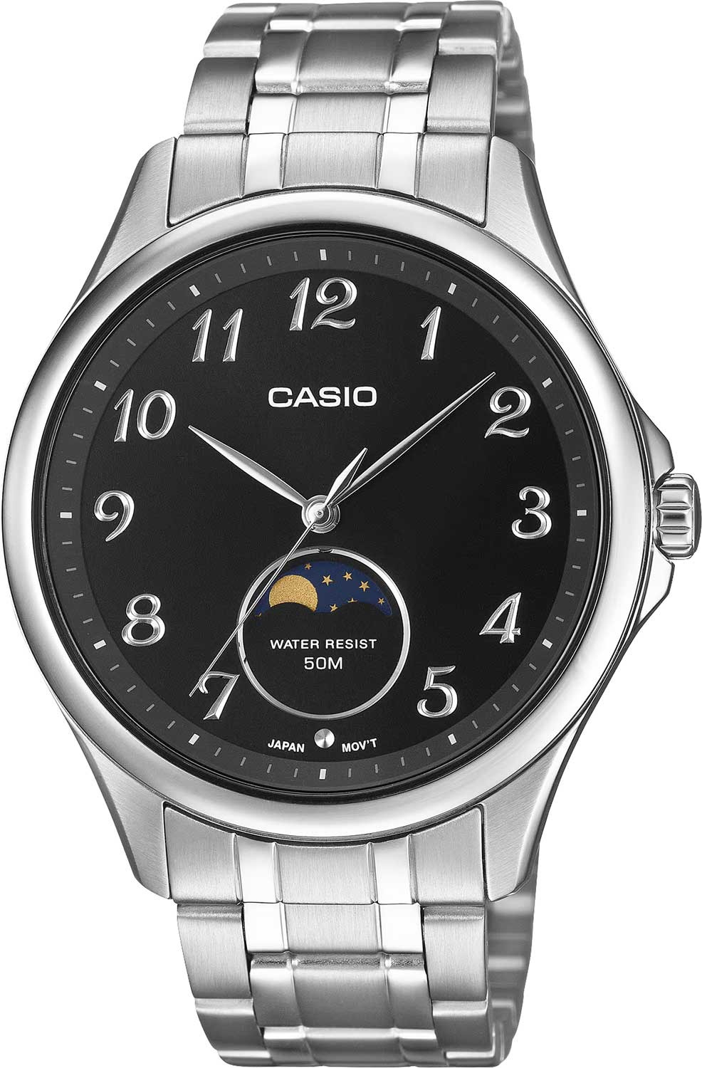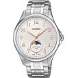 Мужские наручные часы Casio с указателем фазы луны. Питание от батарейки типа SR621SW, рассчитанной на 3 года работы без замены. Заводная головка с защитой. Завинчивающаяся задняя крышка. Браслет с раскладывающейся застежкой, обхват запястья от 150 до 205 мм. Вес часов 113 грамм. Гарантия 1 год.