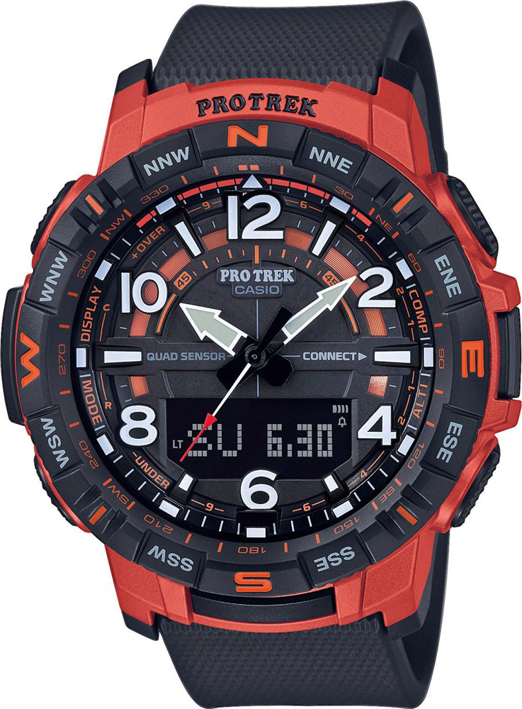 Модель Casio из нового поколения часов Pro Trek, созданных для путешествий, хайкинга и активного времяпровождения на природе. Модуль часов рассчитан на работу при низких температурах до -10°С/14°F. Двойная подcветка: лицо и циферблат подсвечиваются светодиодом, благодаря наличию функции задержки, после отпускания кнопки освещение горит еще несколько секунд. Необритовое светонакопительное покрытие обеспечивает длительное послесвечение в темноте даже после кратковременного нахождения на свету. 3-осевой акселерометр автоматически начинает отсчет шагов на дисплее, когда вы начинаете бегать или участвовать в других действиях во время ношения часов. Шагомер измеряет количество шагов от 0 до 999999. Синхронизация по Bluetooth со смартфоном на котором запущено приложение PRO TREK Connected. При подключении к смартфону часы корректируют текущее время. Мировое время – 38 городов (38 часовых поясов), всемирное координированное время (UTC). Автоматический переход на зимнее и летнее время, возможность включения/отключения данной функции. 12-ти и 24-х часовой формат времени. Вращающийся безель. Время восхода и захода Солнца. Технология Quad Sensor позволяет точно и легко определять сторону света, температуру и атмосферное давление. Термометр от -10° до +60°С с точностью 0,1°C. Барометр - измерение атмосферного давления от 260 до 1100 гПа (от 195 до 825 мм рт. ст.). Встроенный цифровой компас. Диапазон измерения от 0° до 359° с точностью 1°. Высотомер - встроенный датчик барометрического давления с возможностью вывода результатов в единицах высоты над уровнем моря (от -700 до 10000 метров). График набора высоты. Хранение до 40 записей о высотных точках рельефа местности - измеренной абсолютной высоты, даты и времени. С помощью встроенного датчика GPS на смартфоне, можно определить высоту, установить пункт назначения или функцию возвращения назад. Секундомер с точностью показаний 1/100 с и временем измерения 24 ч. Сплит-хронограф. Таймер обратного отсчета от 1 с до 1 ч. Функции перемещения стрелок для беспрепятственного просмотра информации на цифровых дисплеях, отключения/включения звука и поиска телефона. Индикатор заряда батареи. 5 будильников, ежечасный сигнал. Автоматический календарь до 2099 года. Вес 64 грамма. Гарантия 1 год.