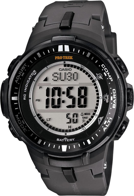 Наручные часы Casio PRW-3000-1E имеют неплохое преимущество перед своими конкурентами ввиду своей долговечности, прочности и многофункциональности. Данная модель располагает целым рядом функций и возможностей: автоматическая светодиодная подсветка, заряд от солнечной батареи, цифровой компас, высотометр, барометр, термометр, таймер, секундомер и будильник – это все, что нужно для полноценного активного отдыха с наручными часами Касио PRW30001E.