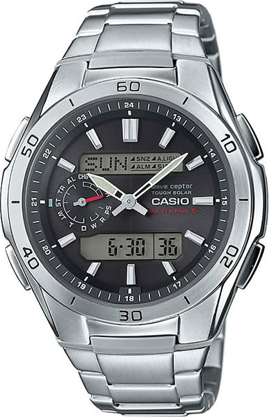 Питание от солнечной энергии, индикатор заряда батареи. Циферблат подсвечивается светодиодом, при недостаточном освещении во время поворота запястья в сторону лица подсветка включается автоматически. Светонакопительное покрытие необрит продолжает светиться в темноте даже после непродолжительного пребывания на свету. Технология Wave Ceptor - в Европе или Северной Америке, во многих частях Канады и Центральной Америки, Японии и Китае после настройки часов на местный часовой пояс, часы будут получать радиосигнал калибровки, гарантирующий, что они всегда будут показывать точное время. Секундомер с точностью показаний 1/100с и временем измерения 24ч. Таймер обратного отсчета от 1мин до 1ч. Мировое время. 12-ти и 24-х часовой формат времени. Раскладывающаяся застежка, расстегиваемая одним касанием. 5 будильников, ежечасный сигнал. Вес: 95 г. Гарантия 1 год.