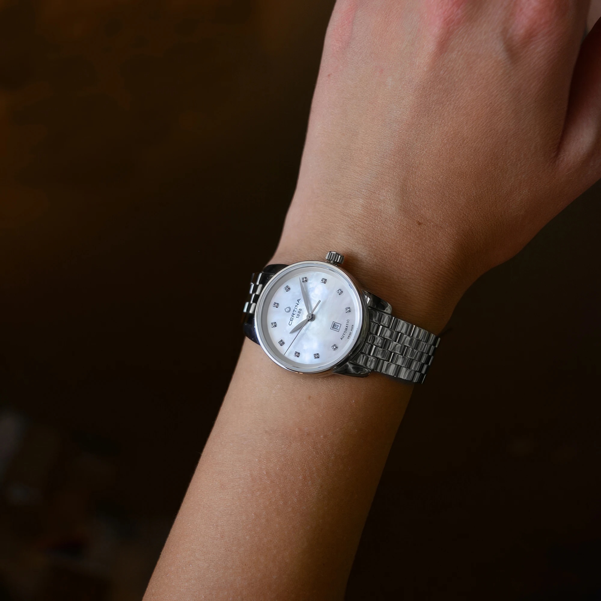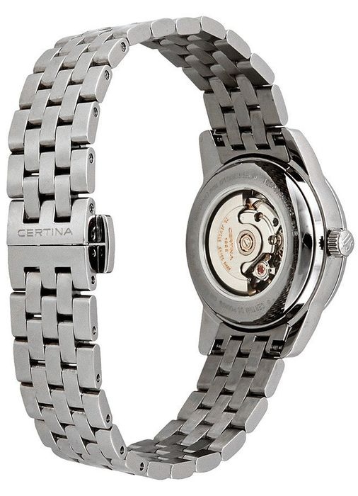 Элегантные механические женские часы Certina. Циферблат украшен 11 бриллиантами 0,022К. Присутствует окошко. Заводная головка с защитой. Прозрачная задняя крышка. Стальной браслет с раскладывающейся застежкой, застежка с системой блокировки. Гарантия 2 года.
