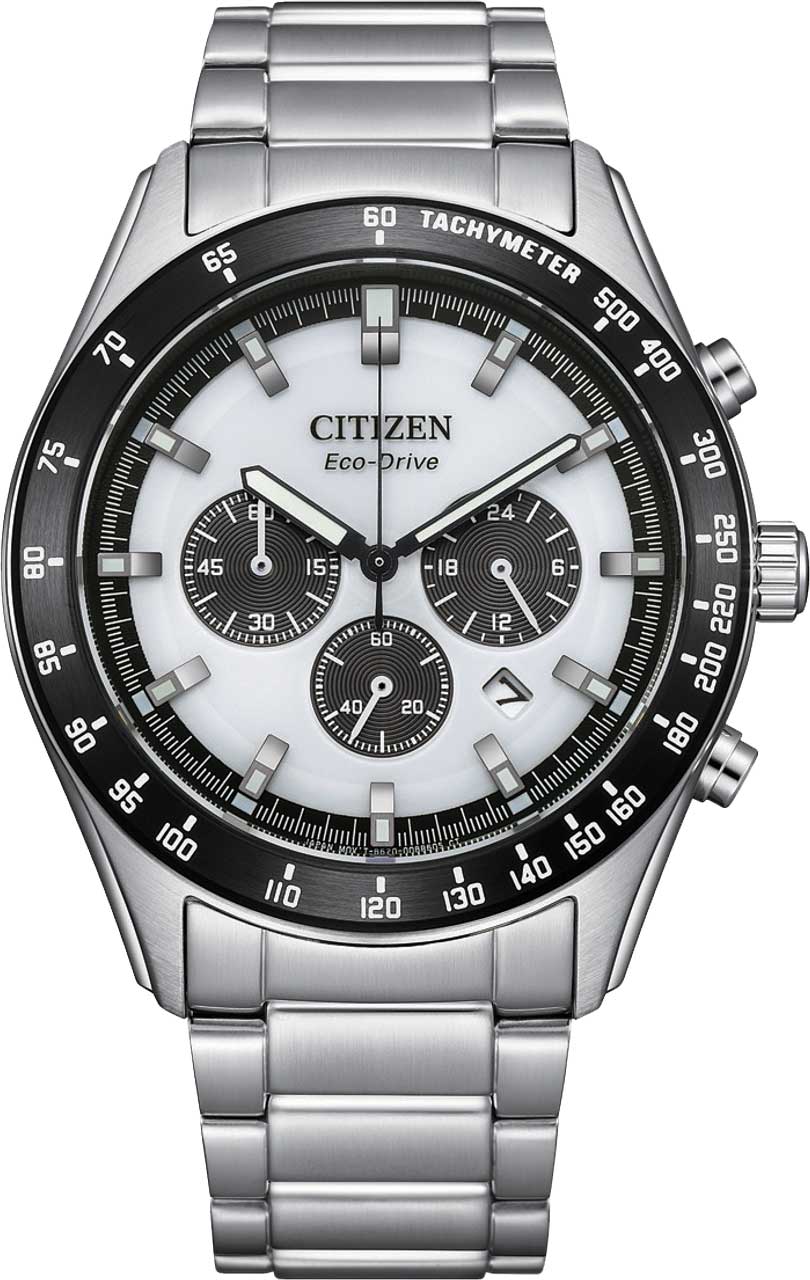 Мужские наручные часы-хронограф с секундомером и тахиметрической шкалой. Система Eco-Drive, не требующая замены батарейки. Питание от солнечной энергии, запас энергии на 270 дней. Функция индикации заряда (EOL) и предотвращения перезарядки. Секундомер с точностью 1/5 сек. и временем измерения 1 час. 12-ти и 24-х часовой формат времени. Секундная стрелка основного времени вынесена на отдельный циферблат. Дополнительно на малом циферблате отображается текущее время в 24-х часовом формате. Завинчивающаяся задняя крышка. Браслет с раскладывающейся застежкой. Гарантия 1 год.