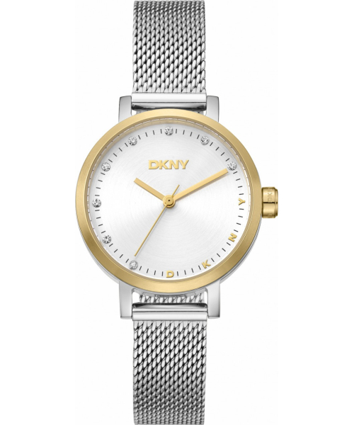 Стильные женские часы от DKNY с круглым стальным корпусом и изящным браслетом, выполненном в технике миланского плетения. Циферблат украшен кристаллами. Гарантия 2 года.