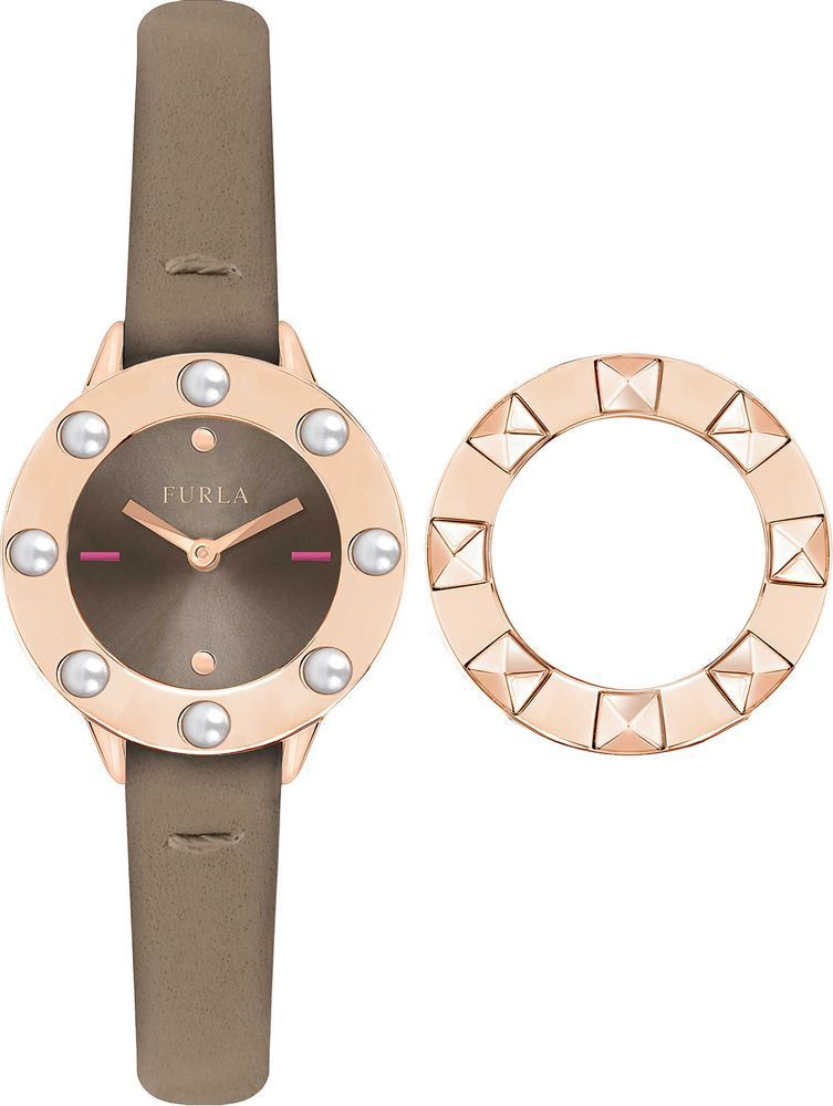 Изящные женские наручные часы от итальянского бренда Furla. В комплекте дополнительный безель с пластиковыми вставками. Гарантия 2 года.