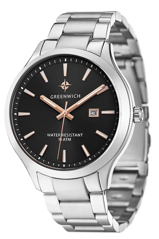 Мужские практичные часы Greenwich Helm с круглым стальным корпусом. Присутствует окошко даты. На часовую, минутную стрелки и индексы нанесено люминесцентное покрытие, что позволяет определять время в темноте. Точность хода обеспечивает японский кварцевый механизм Miyota. Водонепроницаемость часов – 10 АТМ, что позволяет заниматься в них водными видами спорта. Завинчивающаяся задняя крышка украшена изображениями «розы ветров» и корабля, который является символом марки Greenwich. Браслет с раскладывающейся застежкой. Гарантия 2 года.