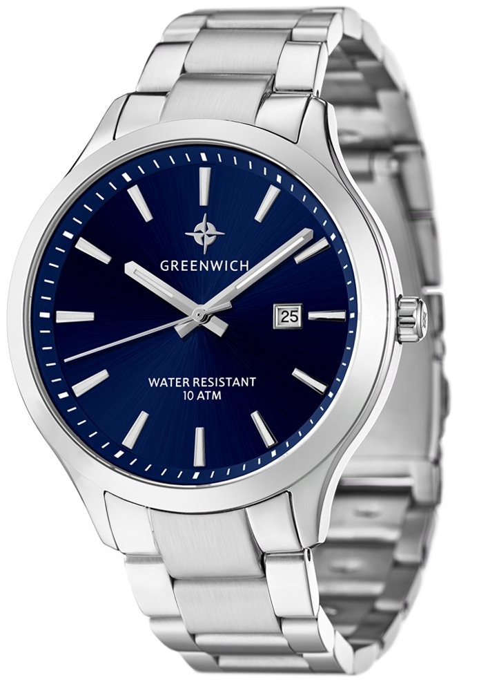 Мужские практичные часы Greenwich Helm с круглым стальным корпусом. Присутствует окошко даты. На часовую, минутную стрелки и индексы нанесено люминесцентное покрытие, что позволяет определять время в темноте. Точность хода обеспечивает японский кварцевый механизм Miyota. Водонепроницаемость часов – 10 АТМ, что позволяет заниматься в них водными видами спорта. Завинчивающаяся задняя крышка украшена изображениями «розы ветров» и корабля, который является символом марки Greenwich. Браслет с раскладывающейся застежкой. Гарантия 2 года.