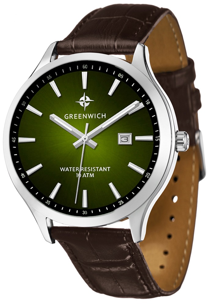 Мужские практичные часы Greenwich Helm с круглым стальным корпусом. Присутствует окошко даты. На часовую, минутную стрелки и индексы нанесено люминесцентное покрытие, что позволяет определять время в темноте. Точность хода обеспечивает японский кварцевый механизм Miyota. Водонепроницаемость часов – 10 АТМ, что позволяет заниматься в них водными видами спорта. Завинчивающаяся задняя крышка украшена изображениями «розы ветров» и корабля, который является символом марки Greenwich. Ремешок из натуральной кожи с классической застежкой. Гарантия 2 года.