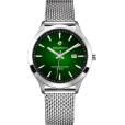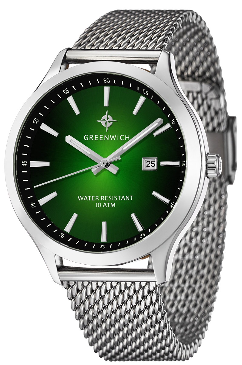Мужские практичные часы Greenwich Helm с круглым стальным корпусом. Присутствует окошко даты. На часовую, минутную стрелки и индексы нанесено люминесцентное покрытие, что позволяет определять время в темноте. Точность хода обеспечивает японский кварцевый механизм Miyota. Водонепроницаемость часов – 10 АТМ, что позволяет заниматься в них водными видами спорта. Завинчивающаяся задняя крышка украшена изображениями «розы ветров» и корабля, который является символом марки Greenwich. Браслет из нержавеющей стали выполнен в технике миланского плетения. Гарантия 2 года.