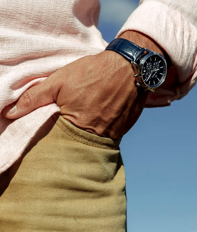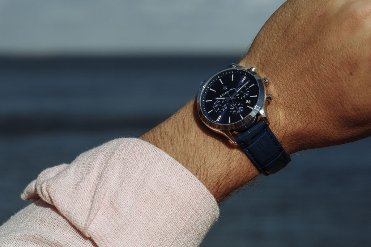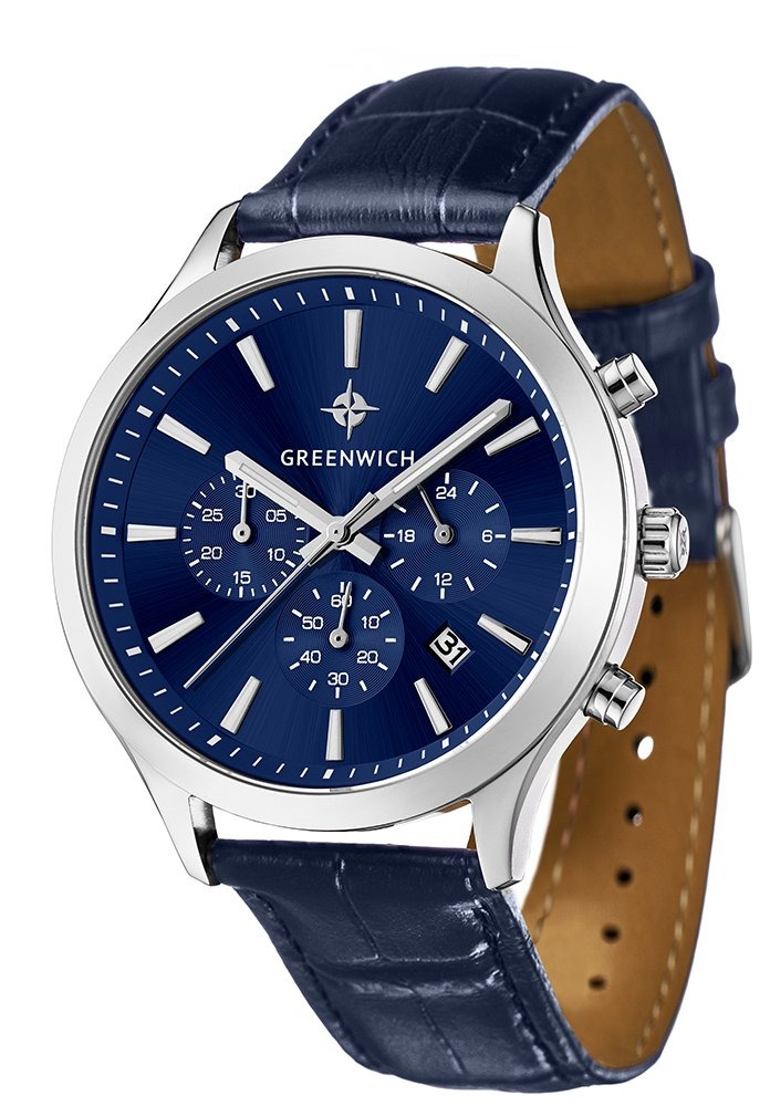 Мужские наручные часы-хронограф Greenwich Skipper с секундомером. Присутствует окошко даты. Дополнительно на малом циферблате отображается текущее время в 24-х часовом формате. На часовую, минутную стрелки и индексы нанесено люминесцентное покрытие, что позволяет определять время в темноте. Точность хода обеспечивает японский кварцевый механизм Miyota. Водонепроницаемость часов – 10 АТМ, что позволяет заниматься в них водными видами спорта. Завинчивающаяся задняя крышка украшена изображениями «розы ветров» и корабля, который является символом марки Greenwich. Ремешок из натуральной кожи с классической застежкой. Гарантия 2 года.