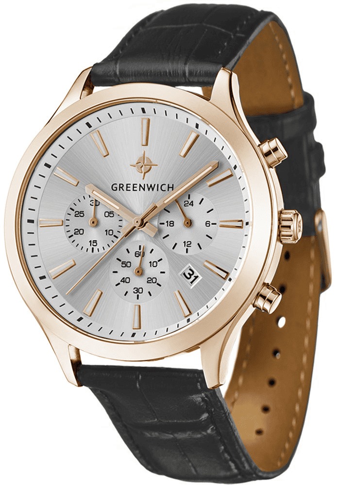 Мужские наручные часы-хронограф Greenwich Skipper с секундомером. Присутствует окошко даты. Дополнительно на малом циферблате отображается текущее время в 24-х часовом формате. На часовую, минутную стрелки и индексы нанесено люминесцентное покрытие, что позволяет определять время в темноте. Точность хода обеспечивает японский кварцевый механизм Miyota. Водонепроницаемость часов – 10 АТМ, что позволяет заниматься в них водными видами спорта. Завинчивающаяся задняя крышка украшена изображениями «розы ветров» и корабля, который является символом марки Greenwich. Ремешок из натуральной кожи с классической застежкой. Гарантия 2 года.