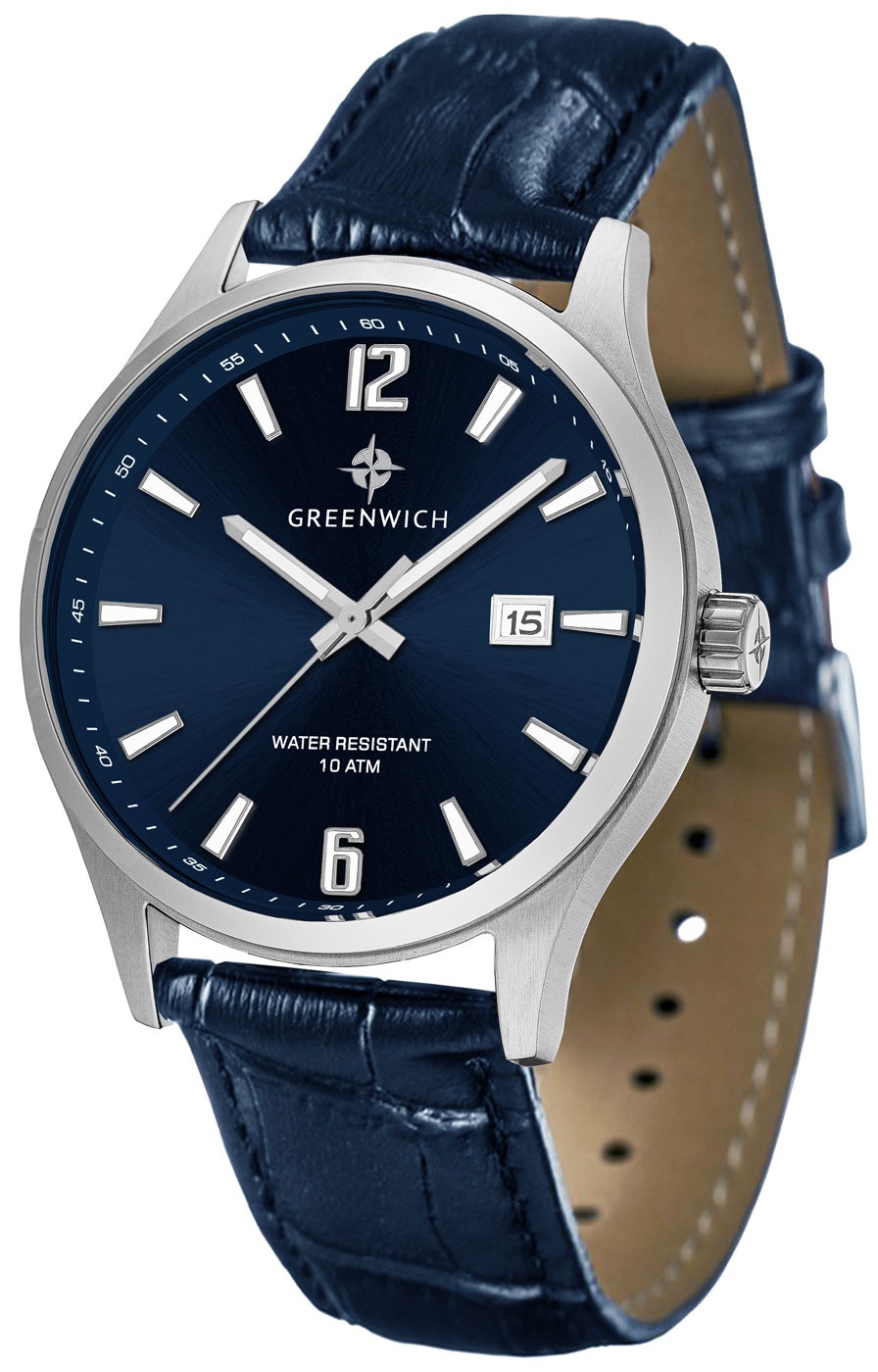 Мужские практичные часы Greenwich Octopus с круглым стальным корпусом. Присутствует окошко даты. На часовую, минутную стрелки и индексы нанесено люминесцентное покрытие, что позволяет определять время в темноте. Точность хода обеспечивает японский кварцевый механизм Miyota. Водонепроницаемость часов – 10 АТМ, что позволяет заниматься в них водными видами спорта. Завинчивающаяся задняя крышка украшена изображениями «розы ветров» и корабля, который является символом марки Greenwich. Ремешок из натуральной кожи с классической застежкой. Гарантия 2 года.