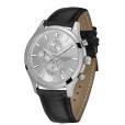 Хронограф из серии Navigator с надежным кварцевым механизмом станет вашим верным спутником в любых путешествиях. Корпус диаметром 43 мм выполнен из нержавеющей стали — прочного и гипоаллергенного материала, идеально подходящего для ежедневного ношения. На изящном серебристом циферблате расположены счетчики минут и секунд, 24-часовой индикатор и оригинальное окно даты. Благодаря люминесцентному покрытию стрелок и меток время легко считывается даже в темноте. Точность хода обеспечивает японский кварцевый механизм Miyota. Водонепроницаемость до 10 атмосфер защищает часы от влаги во время дождя или плавания. Модель дополнена ремешком из натуральной кожи с классической застежкой. Гарантия 2 года.