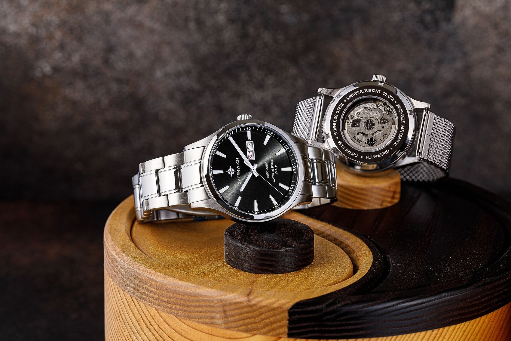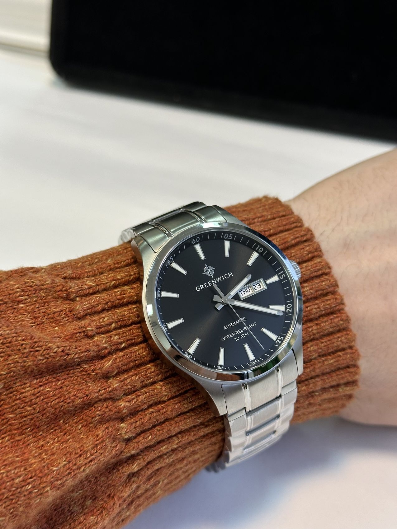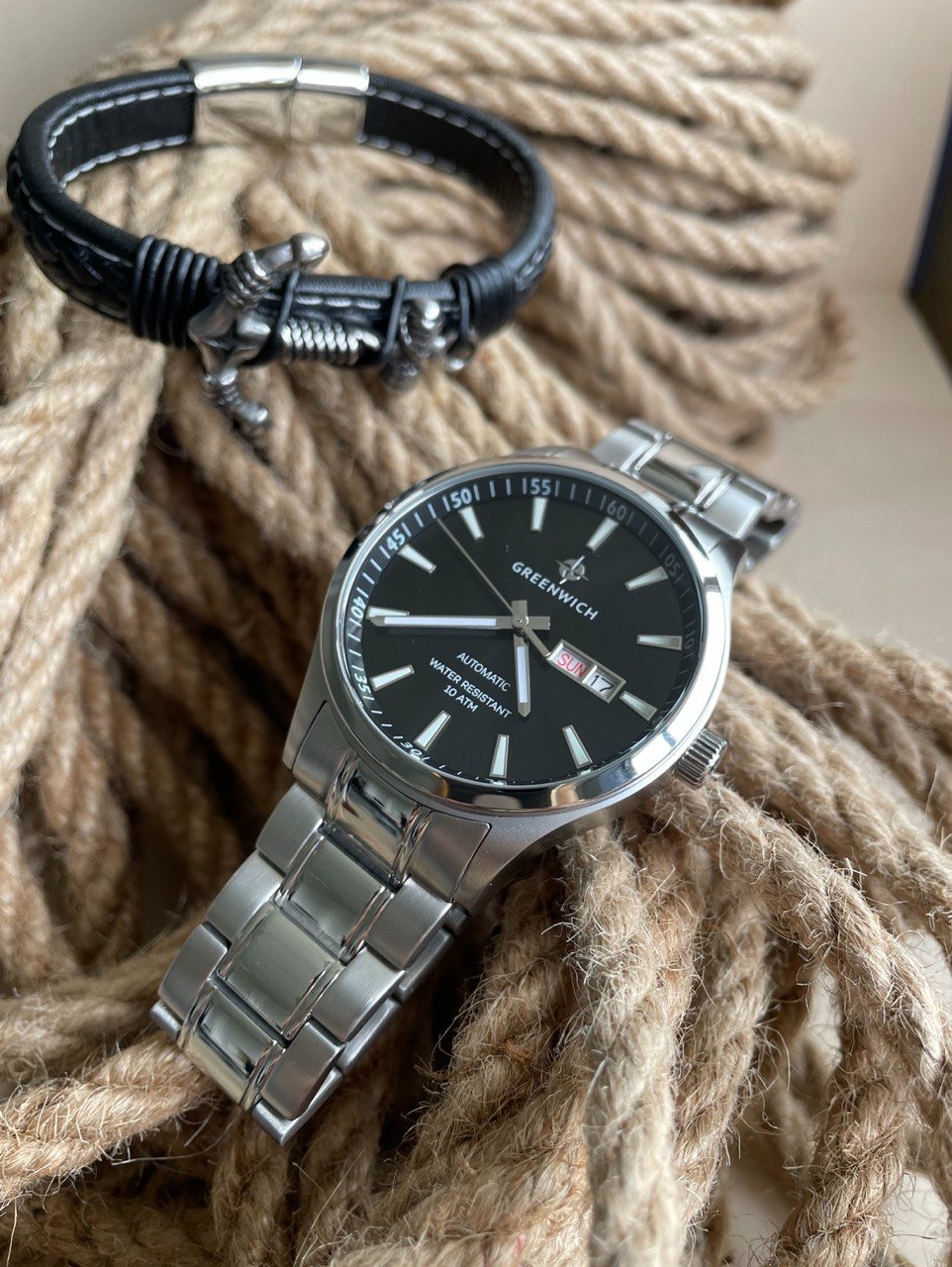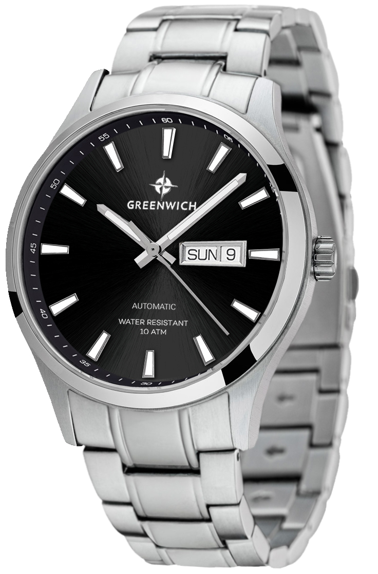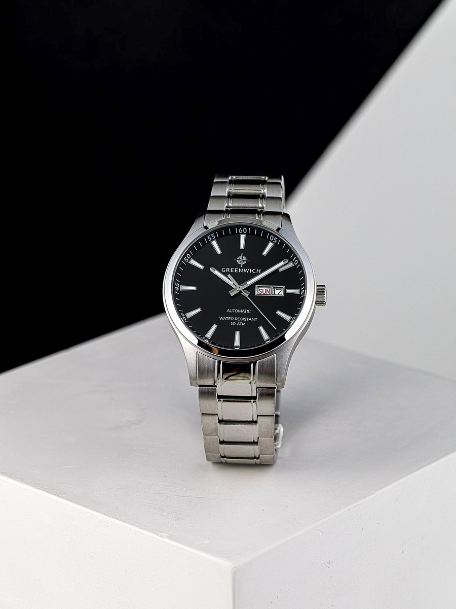 Элегантность, классика и верность традициям — основные черты дизайна часов Good Luck. Нержавеющая сталь корпуса сочетает два типа отделки — зеркальную полировку по безелю и матирование по бокам, создавая гармоничный контраст. Сквозь прозрачную заднюю крышку можно наблюдать работу автоматического механизма TMI с ротором, украшенным гравировкой парусника — символом английских мореходов — и названием серии. Черный циферблат с мягким градиентом и полированной поверхностью оформлен накладными рисками и крупными стрелками с люминесцентным покрытием, обеспечивающим отличную читаемость при любом освещении. Минеральное стекло надежно защищает циферблат, а водонепроницаемость до 10 атмосфер позволяет не беспокоиться о контакте с водой. Модель дополнена стальным браслетом с удобной застежкой-клипсой, оснащённой боковыми кнопками для комфортного использования. Автоматические часы Greenwich созданы для ежедневного ношения: они сочетают стиль, практичность и надежность, а их универсальный дизайн гармонично впишется в любой образ. Гарантия 2 года.