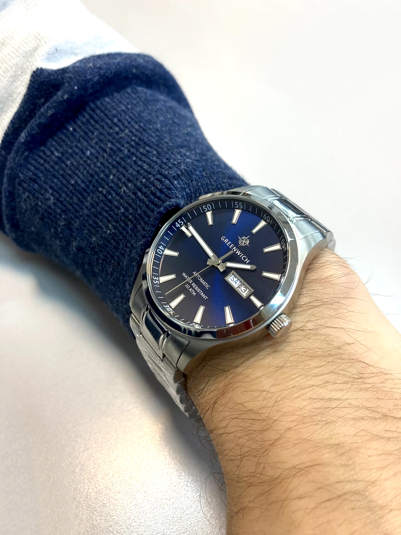 Элегантность, классика и верность традициям — основные черты дизайна часов Good Luck. Нержавеющая сталь корпуса сочетает два типа отделки — зеркальную полировку по безелю и матирование по бокам, создавая гармоничный контраст. Сквозь прозрачную заднюю крышку можно наблюдать работу автоматического механизма TMI с ротором, украшенным гравировкой парусника — символом английских мореходов — и названием серии. Черный циферблат с мягким градиентом и полированной поверхностью оформлен накладными рисками и крупными стрелками с люминесцентным покрытием, обеспечивающим отличную читаемость при любом освещении. Минеральное стекло надежно защищает циферблат, а водонепроницаемость до 10 атмосфер позволяет не беспокоиться о контакте с водой. Модель дополнена стальным браслетом с удобной застежкой-клипсой, оснащённой боковыми кнопками для комфортного использования. Автоматические часы Greenwich созданы для ежедневного ношения: они сочетают стиль, практичность и надежность, а их универсальный дизайн гармонично впишется в любой образ. Гарантия 2 года.