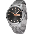 Черный циферблат с мягким градиентом и полированной поверхностью оформлен накладными рисками и крупными стрелками с люминесцентным покрытием, обеспечивающим отличную читаемость при любом освещении. Минеральное стекло надежно защищает циферблат, а водонепроницаемость до 10 атмосфер позволяет не беспокоиться о контакте с водой.