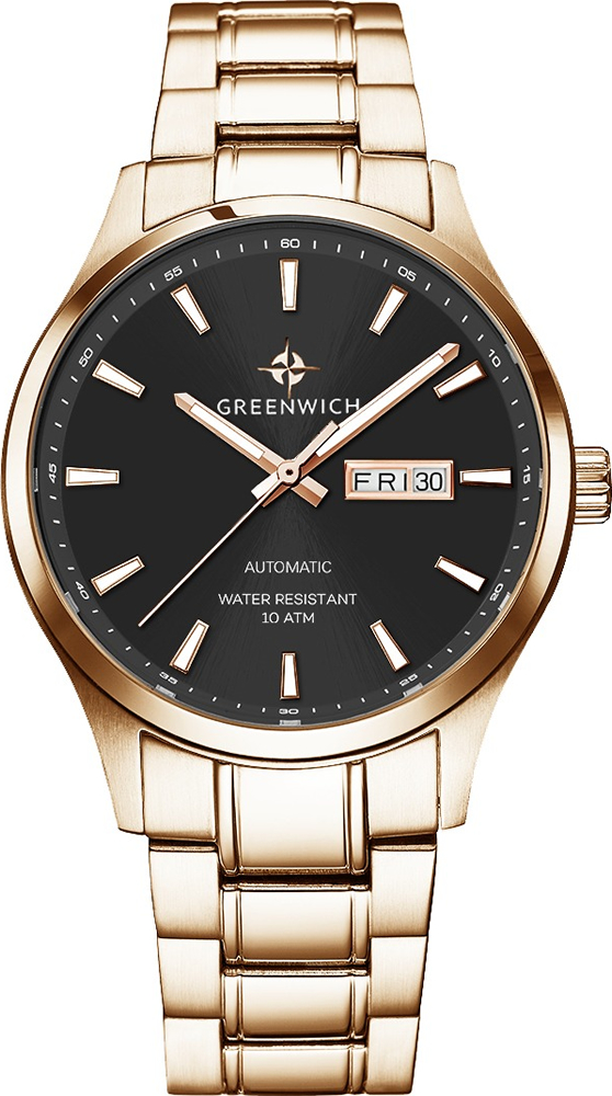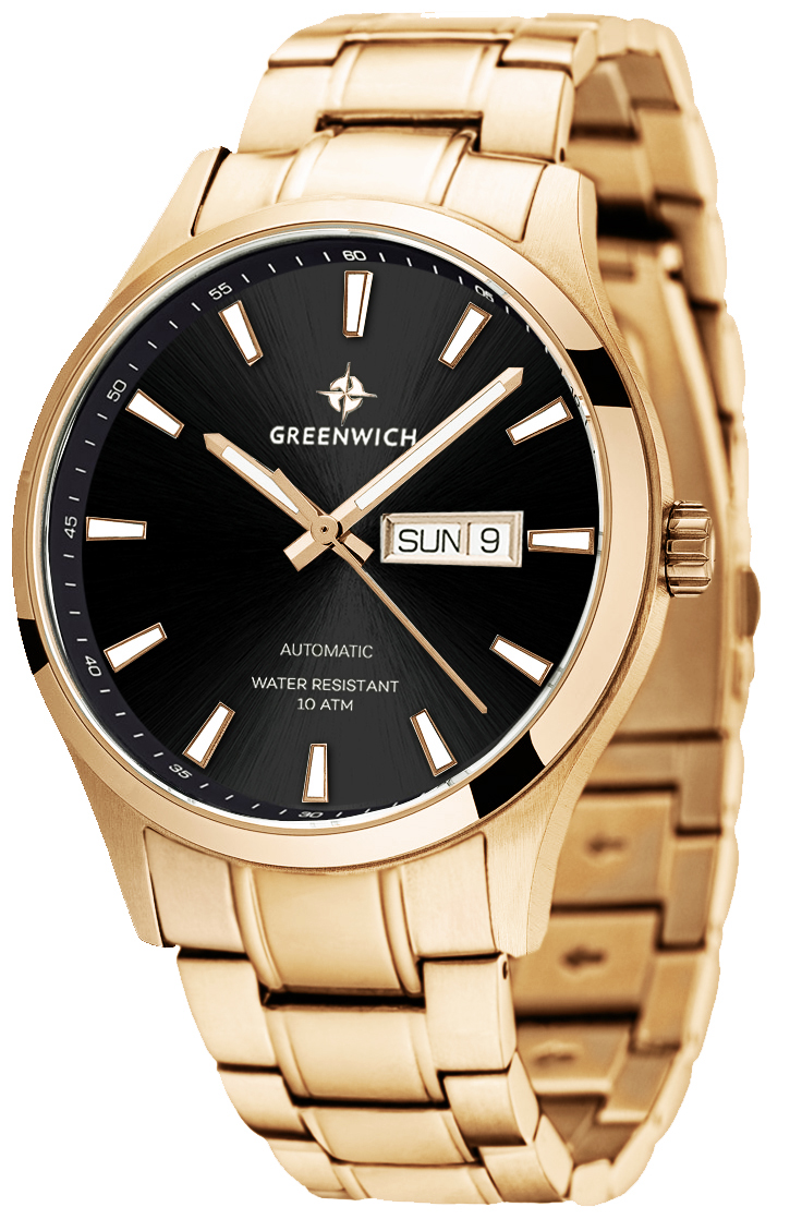 Элегантность, классика и верность традициям — основные черты дизайна часов Good Luck. Нержавеющая сталь корпуса сочетает два типа отделки — зеркальную полировку по безелю и матирование по бокам, создавая гармоничный контраст. Сквозь прозрачную заднюю крышку можно наблюдать работу автоматического механизма TMI с ротором, украшенным гравировкой парусника — символом английских мореходов — и названием серии. Черный циферблат с мягким градиентом и полированной поверхностью оформлен накладными рисками и крупными стрелками с люминесцентным покрытием, обеспечивающим отличную читаемость при любом освещении. Минеральное стекло надежно защищает циферблат, а водонепроницаемость до 10 атмосфер позволяет не беспокоиться о контакте с водой. Модель дополнена стальным браслетом с удобной застежкой-клипсой, оснащённой боковыми кнопками для комфортного использования. Автоматические часы Greenwich созданы для ежедневного ношения: они сочетают стиль, практичность и надежность, а их универсальный дизайн гармонично впишется в любой образ. Гарантия 2 года.